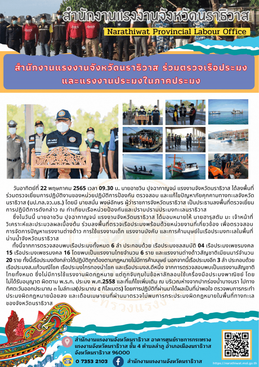 วันอาทิตย์ที่ 22 พฤษภาคม 2565 เวลา 09.30 น. นายอาชวิน ปุจฉากาญจน์ แรงงานจังหวัดนราธิวาส ได้ลงพื้นที่ร่วมตรวจเยี่ยมการปฏิบัติงานของหน่วยปฏิบัติการป้องกัน ตรวจสอบ และแก้ไขปัญหาภัยคุกคามทางทะเลจังหวัดนราธิวาส (นป.ทล.จว.นธ.) โดยมี นายสนั่น พงษ์อักษร ผู้ว่าราชการจังหวัดนราธิวาส เป็นประธานลงพื้นที่ตรวจเยี่ยมการปฏิบิติการดังกล่าว ณ ท่าเทียบเรือหน่วยป้องกันและปราบปรามประมงทะเลนราธิวาส