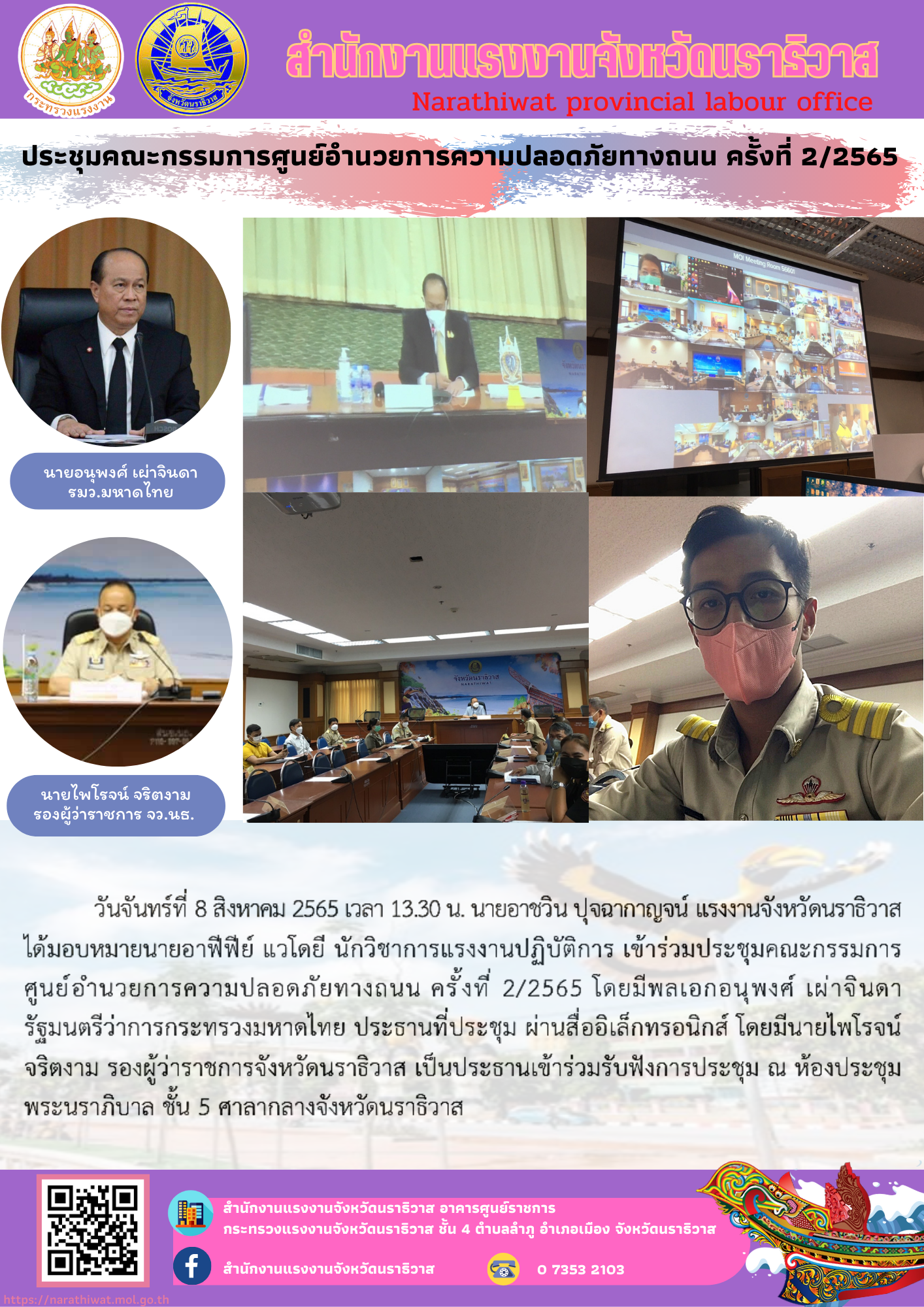 วันจันทร์ที่ 8 สิงหาคม 2565 เวลา 13.30 น. นายอาชวิน ปุจฉากาญจน์ แรงงานจังหวัดนราธิวาส ได้มอบหมายนายอาฟีฟีย์ แวโดยี นักวิชาการแรงงานปฏิบัติการ เข้าร่วมประชุมคณะกรรมการ ศูนย์อำนวยการความปลอดภัยทางถนน ครั้งที่ 2/2565 โดยมีพลเอกอนุพงศ์ เผ่าจินดา รัฐมนตรีว่าการกระทรวงมหาดไทย ประธานที่ประชุม ผ่านสื่ออิเล็กทรอนิกส์ โดยมีนายไพโรจน์ จริตงาม รองผู้ว่าราชการจังหวัดนราธิวาส เป็นประธานเข้าร่วมรับฟังการประชุม ณ ห้องประชุมพระนราภิบาล ชั้น 5 ศาลากลางจังหวัดนราธิวาส