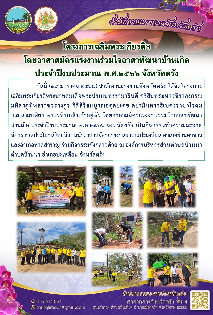 สรจ.ตรัง ได้จัดโครงการเฉลิมพระเกียรติฯ โดยอาสาสมัครแรงงานร่วมใจอาสาพัฒนาบ้านเกิด ประจำปีงบประมาณ พ.ศ.2566