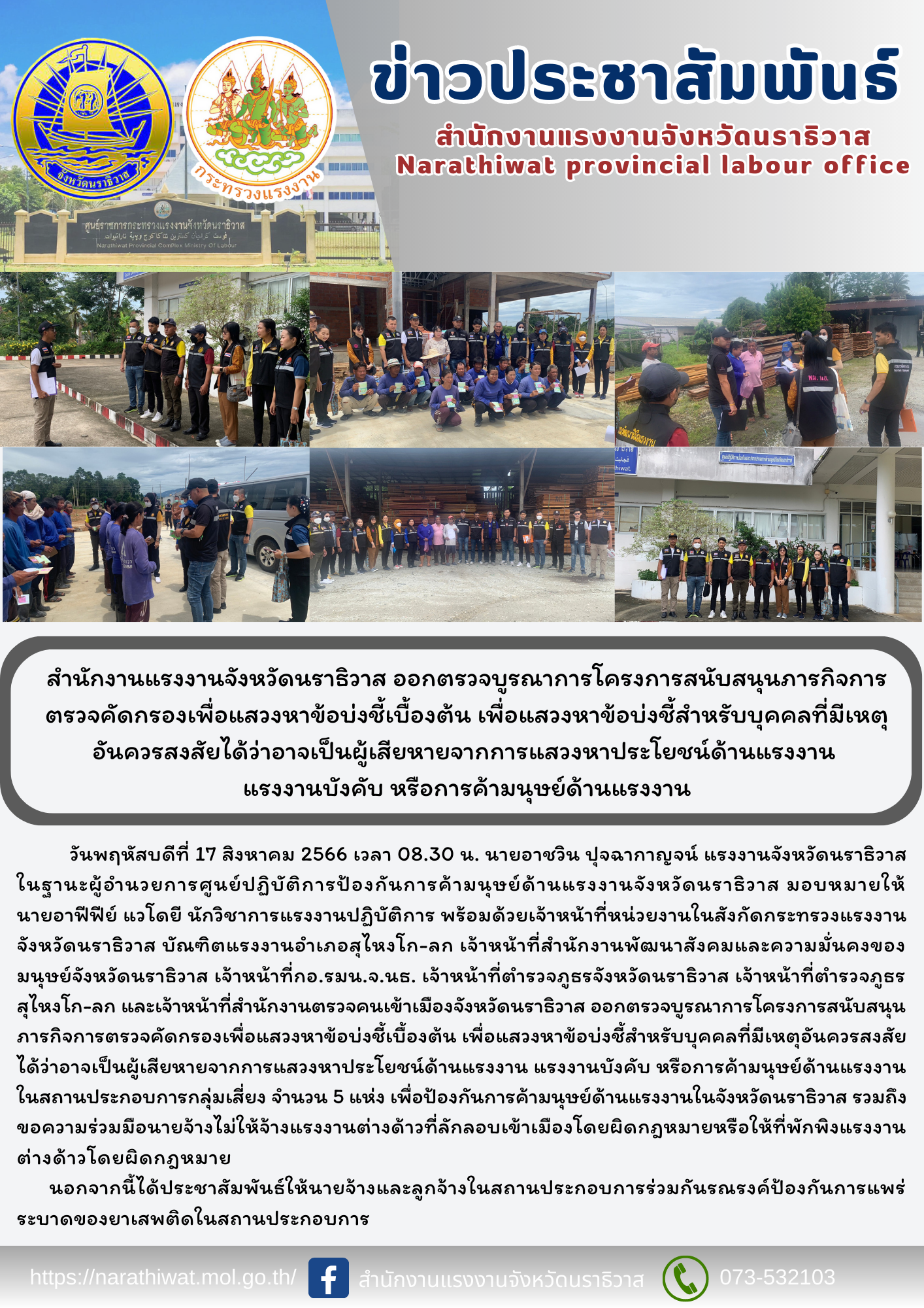 วันพฤหัสบดีที่ 17 สิงหาคม 2566 เวลา 08.30 น. นายอาชวิน ปุจฉากาญจน์ แรงงานจังหวัดนราธิวาส ในฐานะผู้อำนวยการศูนย์ปฏิบัติการป้องกันการค้ามนุษย์ด้านแรงงานจังหวัดนราธิวาส มอบหมายให้ นายอาฟีฟีย์ แวโดยี นักวิชาการแรงงานปฏิบัติการ พร้อมด้วยเจ้าหน้าที่หน่วยงานในสังกัดกระทรวงแรงงานจังหวัดนราธิวาส บัณฑิตแรงงานอำเภอสุไหงโก-ลก เจ้าหน้าที่สำนักงานพัฒนาสังคมและความมั่นคงของมนุษย์จังหวัดนราธิวาส เจ้าหน้าที่กอ.รมน.จ.นธ. เจ้าหน้าที่ตำรวจภูธรจังหวัดนราธิวาส เจ้าหน้าที่ตำรวจภูธรสุไหงโก-ลก และเจ้าหน้าที่สำนักงานตรวจคนเข้าเมืองจังหวัดนราธิวาส ออกตรวจบูรณาการโครงการสนับสนุนภารกิจการตรวจคัดกรองเพื่อแสวงหาข้อบ่งชี้เบื้องต้น เพื่อแสวงหาข้อบ่งชี้สำหรับบุคคลที่มีเหตุอันควรสงสัยได้ว่าอาจเป็นผู้เสียหายจากการแสวงหาประโยชน์ด้านแรงงาน แรงงานบังคับ หรือการค้ามนุษย์ด้านแรงงานในสถานประกอบการกลุ่มเสี่ยง จำนวน 5 แห่ง เพื่อป้องกันการค้ามนุษย์ด้านแรงงานในจังหวัดนราธิวาส รวมถึงขอความร่วมมือนายจ้างไม่ให้จ้างแรงงานต่างด้าวที่ลักลอบเข้าเมืองโดยผิดกฎหมายหรือให้ที่พักพิงแรงงานต่างด้าวโดยผิดกฎหมาย นอกจากนี้ได้ประชาสัมพันธ์ให้นายจ้างและลูกจ้างในสถานประกอบการร่วมกันรณรงค์ป้องกันการแพร่ระบาดของยาเสพติดในสถานประกอบการ