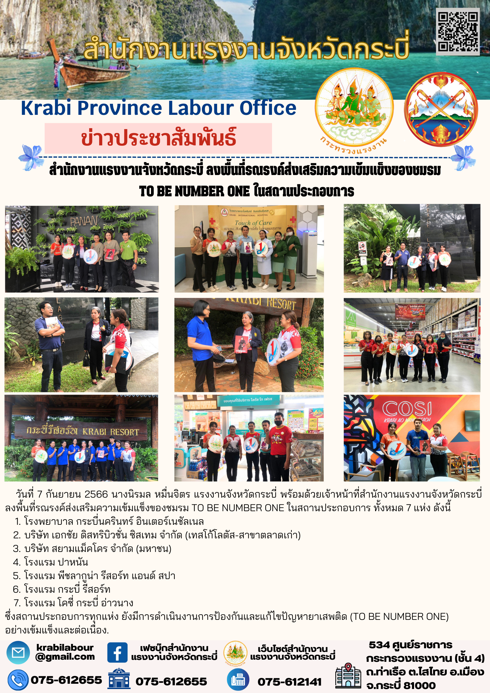 สรจ.กระบี่ ลงพื้นที่รณรงค์ส่งเสริมความเข้มแข็งของชมรม TO BE NUMBER ONE ในสถานประกอบการ