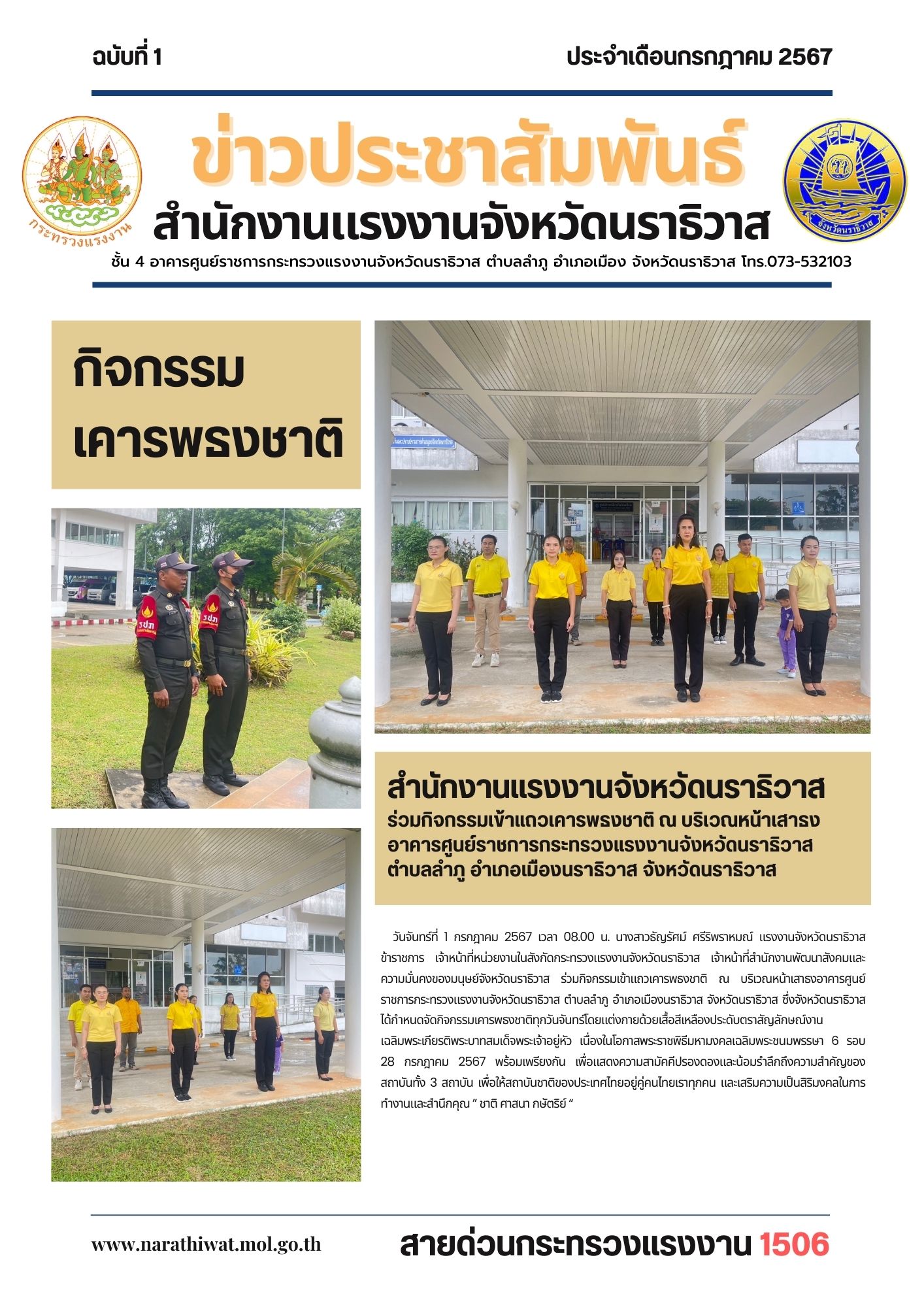 สำนักงานแรงงานจังหวัดนราธิวาส ร่วมกิจกรรมเข้าแถวเคารพธงชาติ ณ บริเวณหน้าเสาธง อาคารศูนย์ราชการกระทรวงแรงงานจังหวัดนราธิวาส ตำบลลำภู อำเภอเมืองนราธิวาส จังหวัดนราธิวาส