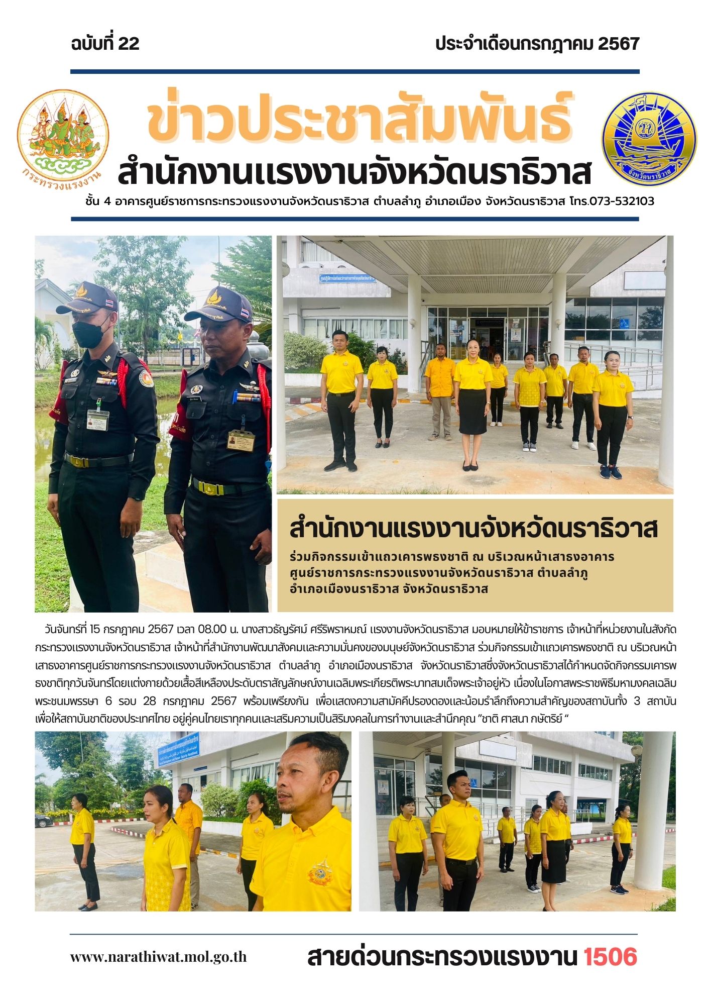 วันจันทร์ที่ 15 กรกฎาคม 2567 เวลา 08.00 น. นางสาวธัญรัศม์ ศรีริพราหมณ์ แรงงานจังหวัดนราธิวาส มอบหมายให้ข้าราชการ เจ้าหน้าที่หน่วยงานในสังกัดกระทรวงแรงงานจังหวัดนราธิวาส เจ้าหน้าที่สำนักงานพัฒนาสังคมและความมั่นคงของมนุษย์จังหวัดนราธิวาส ร่วมกิจกรรมเข้าแถวเคารพธงชาติ ณ บริเวณหน้าเสาธงอาคารศูนย์ราชการกระทรวงแรงงานจังหวัดนราธิวาส ตำบลลำภู อำเภอเมืองนราธิวาส จังหวัดนราธิวาสซึ่งจังหวัดนราธิวาสได้กำหนดจัดกิจกรรมเคารพธงชาติทุกวันจันทร์โดยแต่งกายด้วยเสื้อสีเหลืองประดับตราสัญลักษณ์งานเฉลิมพระเกียรติพระบาทสมเด็จพระเจ้าอยู่หัว เนื่องในโอกาสพระราชพิธีมหามงคลเฉลิมพระชนมพรรษา 6 รอบ 28 กรกฎาคม 2567 พร้อมเพรียงกัน เพื่อแสดงความสามัคคีปรองดองและน้อมรำลึกถึงความสำคัญของสถาบันทั้ง 3 สถาบัน เพื่อให้สถาบันชาติของประเทศไทย อยู่คู่คนไทยเราทุกคนและเสริมความเป็นสิริมงคลในการทำงานและสำนึกคุณ ”ชาติ ศาสนา กษัตริย์ “