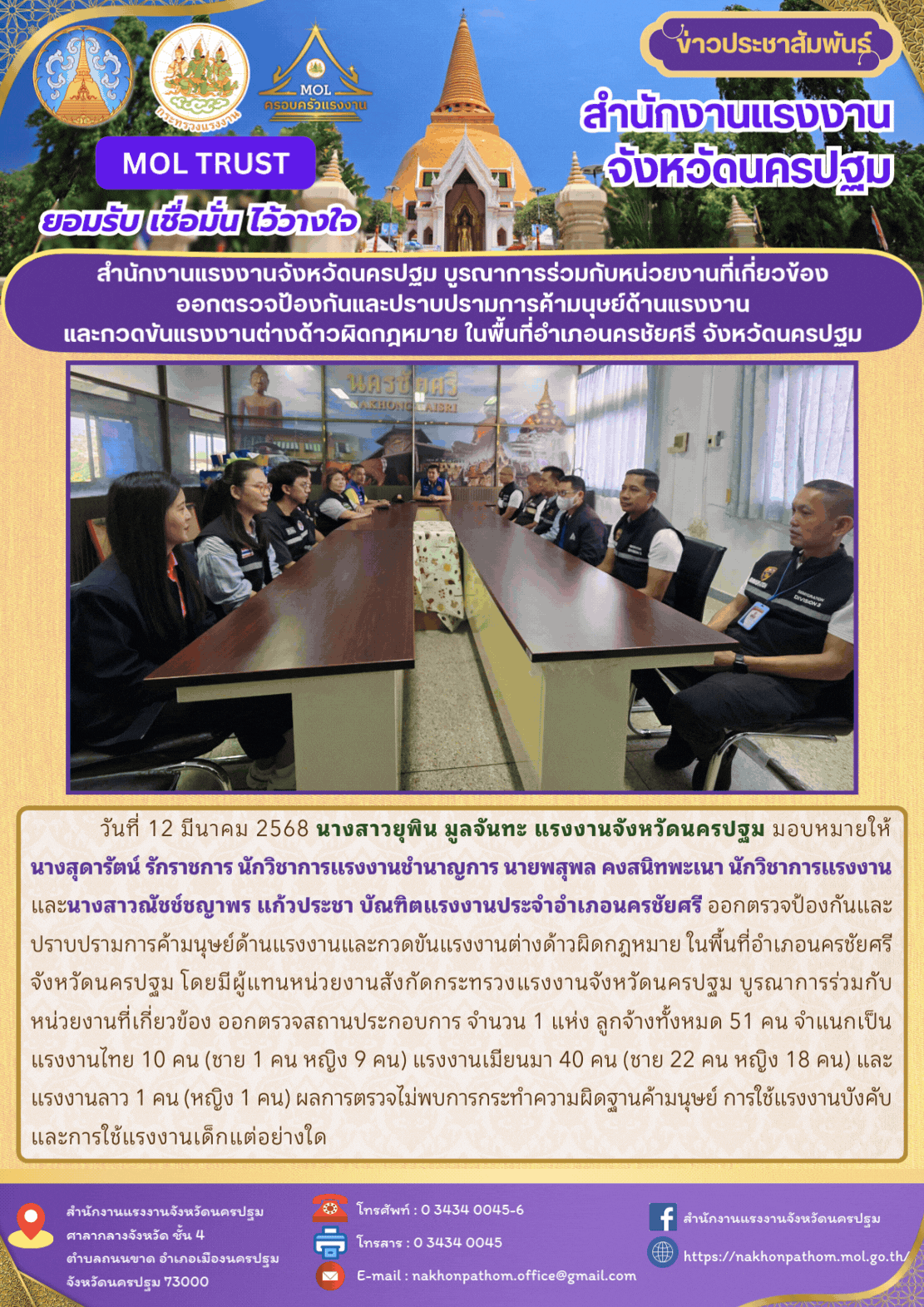 สำนักงานแรงงานจังหวัดนครปฐม บูรณาการร่วมกับหน่วยงานที่เกี่ยวข้องออกตรวจป้องกันและปราบปรามการค้ามนุษย์ด้านแรงงานและกวดขันแรงงานต่างด้าวผิดกฎหมาย ในพื้นที่อำเภอนครชัยศรี จังหวัดนครปฐม