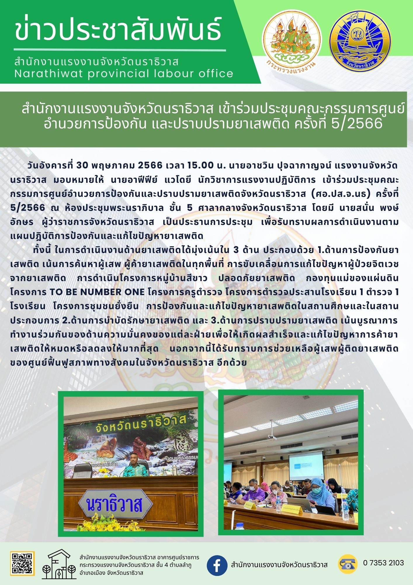 วันอังคารที่ 30 พฤษภาคม 2566 เวลา 15.00 น. นายอาชวิน ปุจฉากาญจน์ แรงงานจังหวัดนราธิวาส มอบหมายให้ นายอาฟีฟีย์ แวโดยี นักวิชาการแรงงานปฏิบัติการ เข้าร่วมประชุมคณะกรรมการศูนย์อำนวยการป้องกันและปราบปรามยาเสพติดจังหวัดนราธิวาส (ศอ.ปส.จ.นธ) ครั้งที่ 5/2566 ณ ห้องประชุมพระนราภิบาล ชั้น 5 ศาลากลางจังหวัดนราธิวาส โดยมี นายสนั่น พงษ์อักษร ผู้ว่าราชการจังหวัดนราธิวาส เป็นประธานการประชุม เพื่อรับทราบผลการดำเนินงานตามแผนปฎิบัติการป้องกันและแก้ไขปัญหายาเสพติด ทั้งนี้ ในการดำเนินงานด้านยาเสพติดได้มุ่งเน้นใน 3 ด้าน ประกอบด้วย 1.ด้านการป้องกันยาเสพติด เน้นการค้นหาผู้เสพ ผู้ค้ายาเสพติดในทุกพื้นที่ การขับเคลื่อนการแก้ไขปัญหาผู้ป่วยจิตเวชจากยาเสพติด การดำเนินโครงการหมู่บ้านสีขาว ปลอดภัยยาเสพติด กองทุนแม่ของแผ่นดินโครงการ TO BE NUMBER ONE โครงการครูตำรวจ โครงการตำรวจประสานโรงเรียน 1 ตำรวจ 1 โรงเรียน โครงการชุมชนยั่งยืน การป้องกันและแก้ไขปัญหายาเสพติดในสถานศึกษและในสถานประกอบการ 2.ด้านการบำบัดรักษายาเสพติด และ 3.ด้านการปราบปรามยาเสพติด เน้นบูรณาการทำงานร่วมกันของด้านความมั่นคงของแต่ละฝ่ายเพื่อให้เกิดผลสำเร็จและแก้ไขปัญหาการค้ายาเสพติดให้หมดหรือลดลงให้มากที่สุด นอกจากนี้ได้รับทราบการช่วยเหลือผู้เสพผู้ติดยาเสพติดของศูนย์ฟื้นฟูสภาพทางสังคมในจังหวัดนราธิวาส อีกด้วย