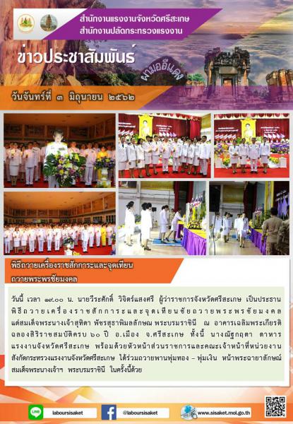 สำนักงานแรงงานศรีสะเกษ ร่วมพิธีถวายเครื่องราชสักการะและจุดเทียน ถวายพระพรชัยมงคล ณ อาคารเฉลิมพระเกียรติฉลองสิริราชสมบัติครบ 60 ปี อ.เมือง จ.สรีสะเกษ