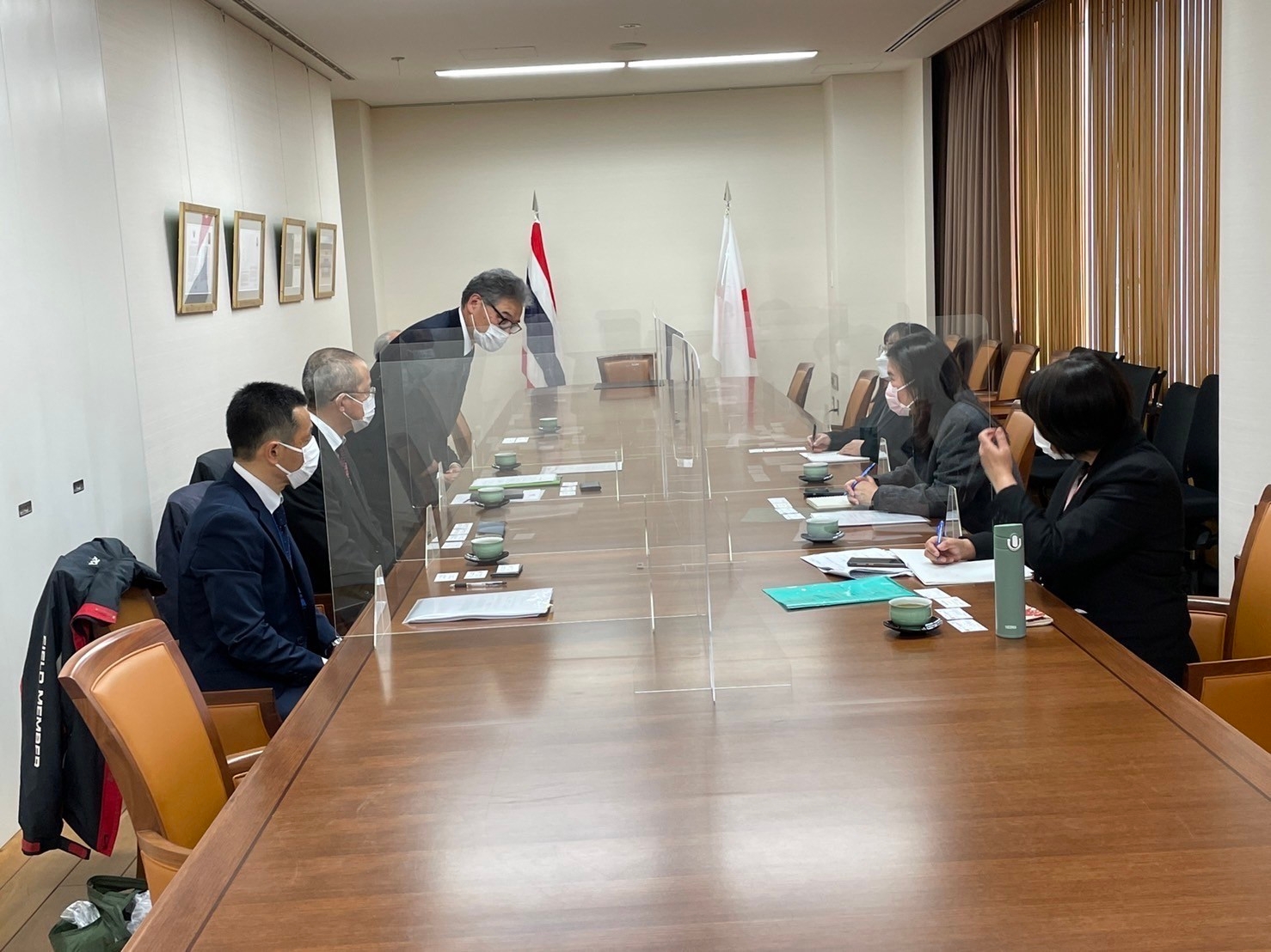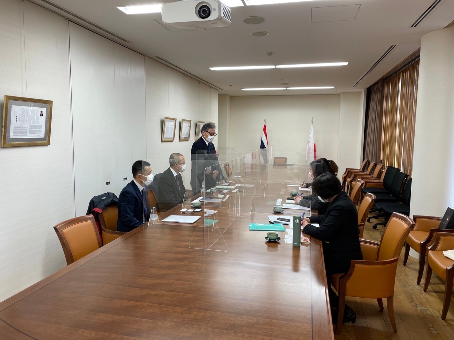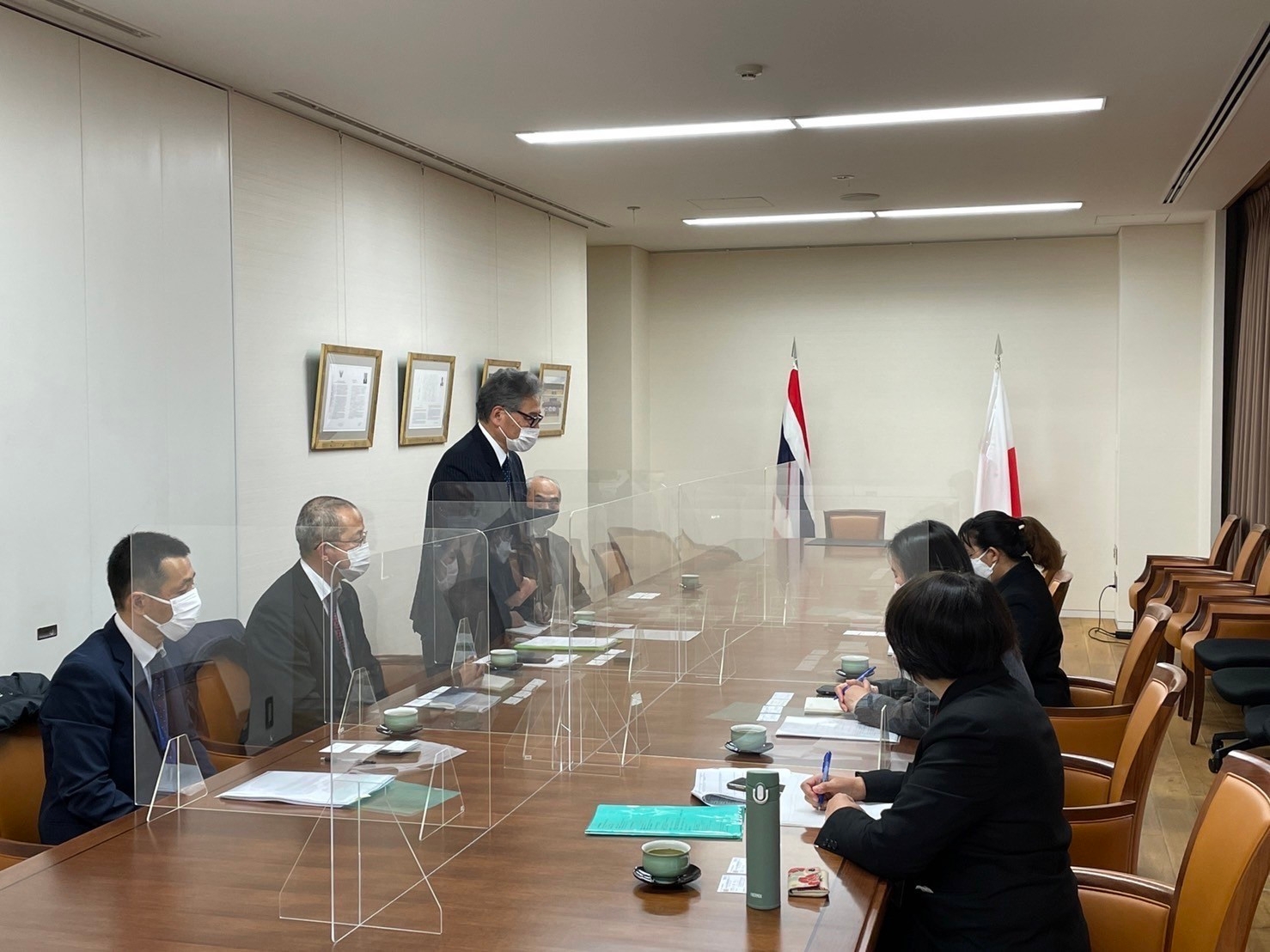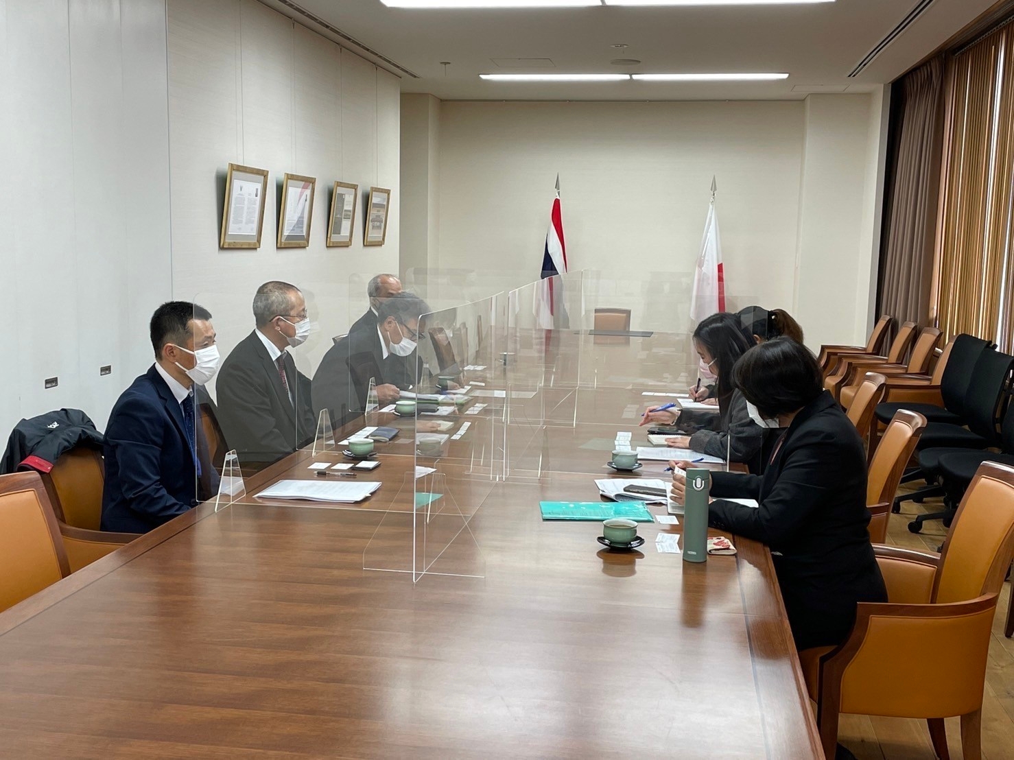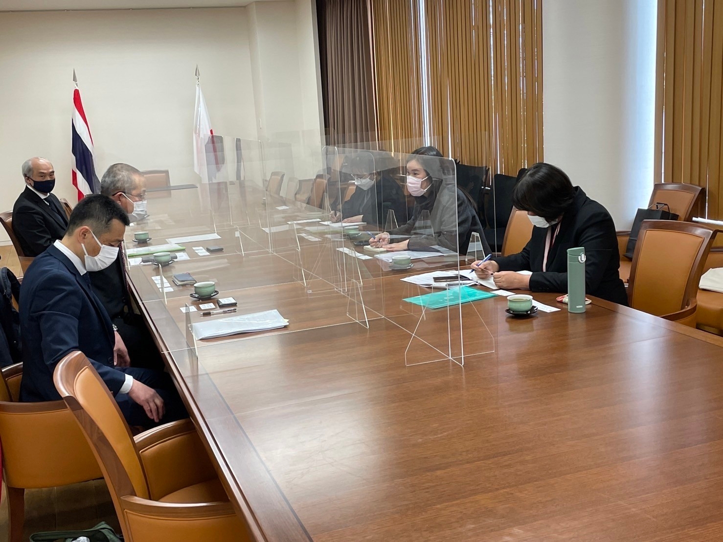 เมื่อวันที่ 22 มีนาคม 2565 เวลา 14.00 น. (ตามเวลาท้องถิ่นประเทศญี่ปุ่น ซึ่งเร็วกว่าประเทศไทย 2 ชั่วโมง) นางสาวสดุดี กิตติสุวรรณ อัครราชทูตที่ปรึกษา (ฝ่ายแรงงาน) สำนักงานแรงงานในประเทศญี่ปุ่น พร้อมด้วยนางสาวเกศสุดา มงคลชาติ ที่ปรึกษา (ฝ่ายแรงงาน) ให้การต้อนรับผู้แทนสมาคมสไลด์เนื้อสด (เนื้อหมู เนื้อวัว) จำนวน 4 ราย ได้แก่ (1) Mr. ASOU Seiji ตำแหน่ง Executive Director, The General Incorporated Foundation for International Education (2) Mr. HORIKE Minoru ตำแหน่ง Administration Division, บริษัท JA ZEN-Noh Meat Foods จำกัด (3) Mr. OBARA Kaz ตำแหน่ง President, Federal Meat Academy และ (4) Mr. UCHIDA Tasuku ตำแหน่ง ผู้ดูแลระบบและตรวจสอบภายใน, Federal Meat Academy ณ ห้องประชุม ชั้น 2 สถานเอกอัครราชทูต ณ กรุงโตเกียว โดยวัตถุประสงค์ของการเข้าเยี่ยมคารวะครั้งนี้ เพื่อขอความร่วมมือฝ่ายไทยในการสนับสนุนข้อมูลประกอบการนำเสนอต่อคณะกรรมการของกระทรวงสาธารณสุข แรงงานและสวัสดิการญี่ปุ่น เพื่อผลักดันเพิ่มงานแปรรูปเนื้อสัตว์ สาขาการสไลด์เนื้อสด (เนื้อหมู เนื้อวัว) (Slice Meat) สำหรับผู้ฝึกปฏิบัติงานด้านเทคนิคต่างชาติอีกสาขาหนึ่ง ซึ่งสมาคมฯ มีความตั้งใจและต้องการให้แรงงานต่างชาติเข้ามาเรียนรู้ทักษะดังกล่าว เพื่อให้มีการสไลด์เนื้อสดได้อย่างถูกต้องและถูกสุขลักษณะ ผู้ฝึกปฏิบัติงานด้านเทคนิคสามารถนำความรู้ที่ได้จากการฝึกงานในสาขานี้กลับไปใช้ประโยชน์ในการทำงานต่อที่ประเทศของตน โดยในเบื้องต้นคณะกรรมการของกระทรวงสาธารณสุข แรงงานและสวัสดิการญี่ปุ่นยอมรับว่าเป็นทักษะที่ผู้ฝึกปฏิบัติงานด้านเทคนิคต่างชาติต้องมาเรียนรู้ ซึ่งผู้แทนสมาคมฯ กล่าวว่า ได้เล็งเห็นว่าปัจจุบันเนื้อวากิวของญี่ปุ่นได้รับความนิยมในหลายประเทศ รวมถึงประเทศไทย ซึ่งมีวัฒนธรรมการรับประทานอาหารคล้ายกับคนญี่ปุ่น รวมถึงมีร้านอาหารญี่ปุ่นจำนวนมาก และประเทศไทยมีพัฒนาการด้านเศรษฐกิจที่ดี จึงเห็นว่างานแปรรูปเนื้อสัตว์ สาขาการสไลด์เนื้อสด (เนื้อหมู เนื้อวัว) (Slice Meat) จะช่วยเติมเต็มในเรื่องการทำงานและการรับประทานเนื้อสด (เนื้อหมู เนื้อวัว) อย่างถูกต้องมีรสชาติอร่อย และมีสุขอนามัย โดยขณะนี้สมาคมฯ ต้องการขอรับการสนับสนุนจากสำนักงานแรงงานไทยในประเทศญี่ปุ่น เพื่อนำไปประกอบการนำเสนอต่อคณะกรรมการของกระทรวงสาธารณสุข แรงงานและสวัสดิการญี่ปุ่น