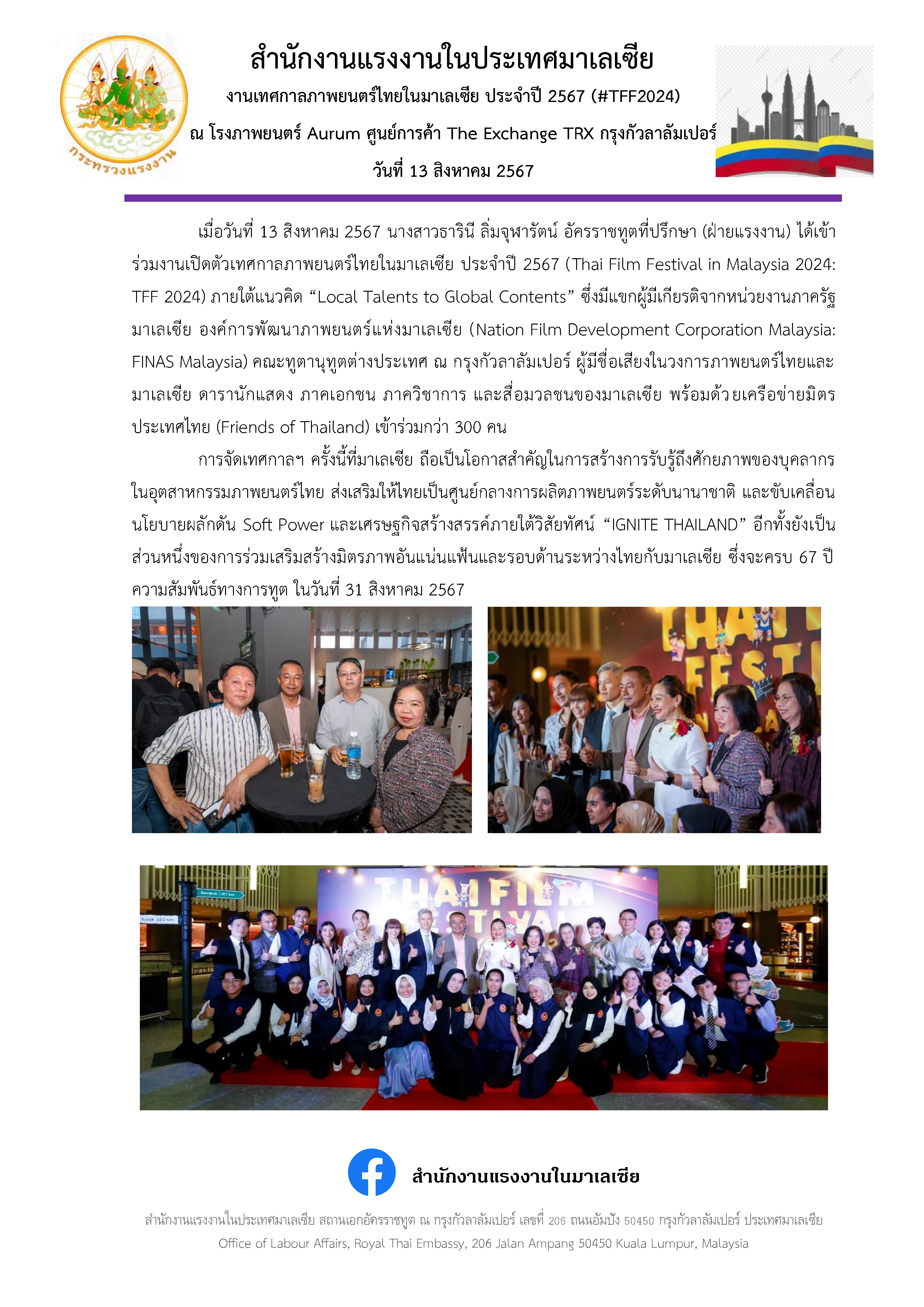 สำนักงานแรงงานในประเทศมาเลเซีย งานเทศกาลภาพยนตร์ไทยในมาเลเซีย ประจำปี 2567