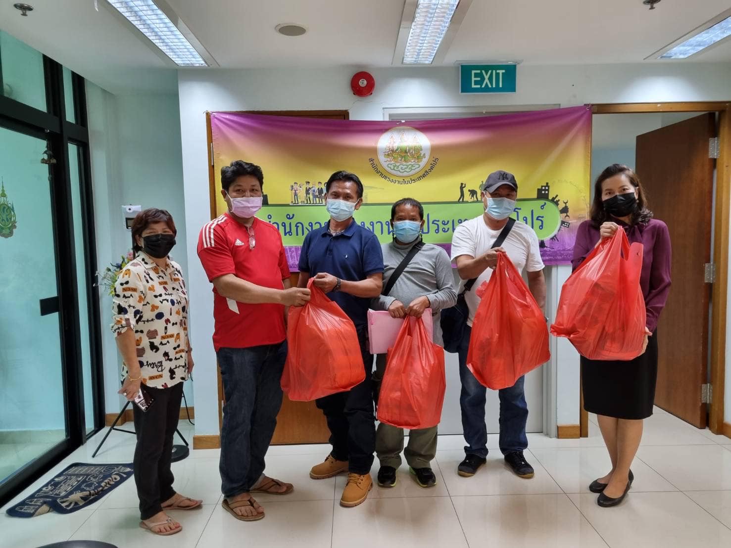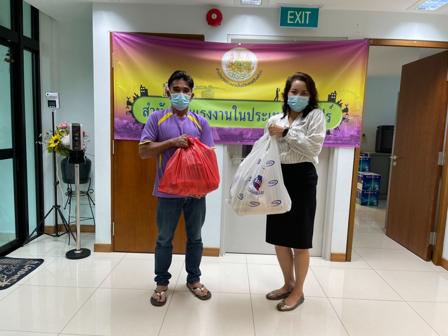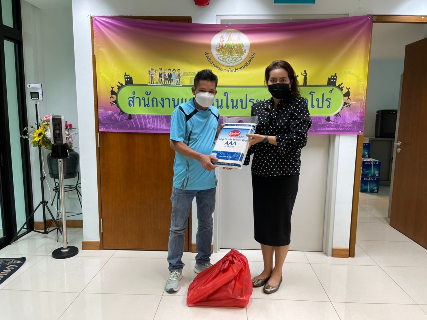 สำนักงานแรงงานในประเทศสิงคโปร์มอบข้าวสาร อาหารแห้ง และสิ่งของจำเป็นให้แก่แรงงานไทยในสิงคโปร์ที่มาติดต่อฝ่ายกงสุล และสำนักงานแรงงานในประเทศสิงคโปร์