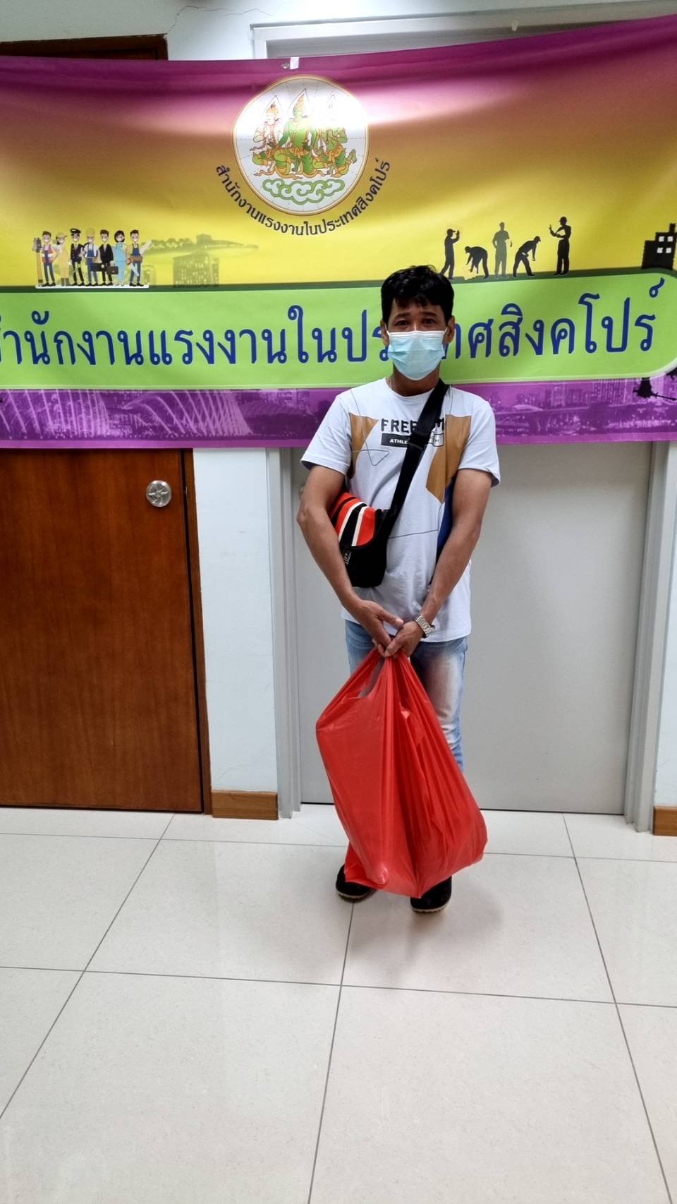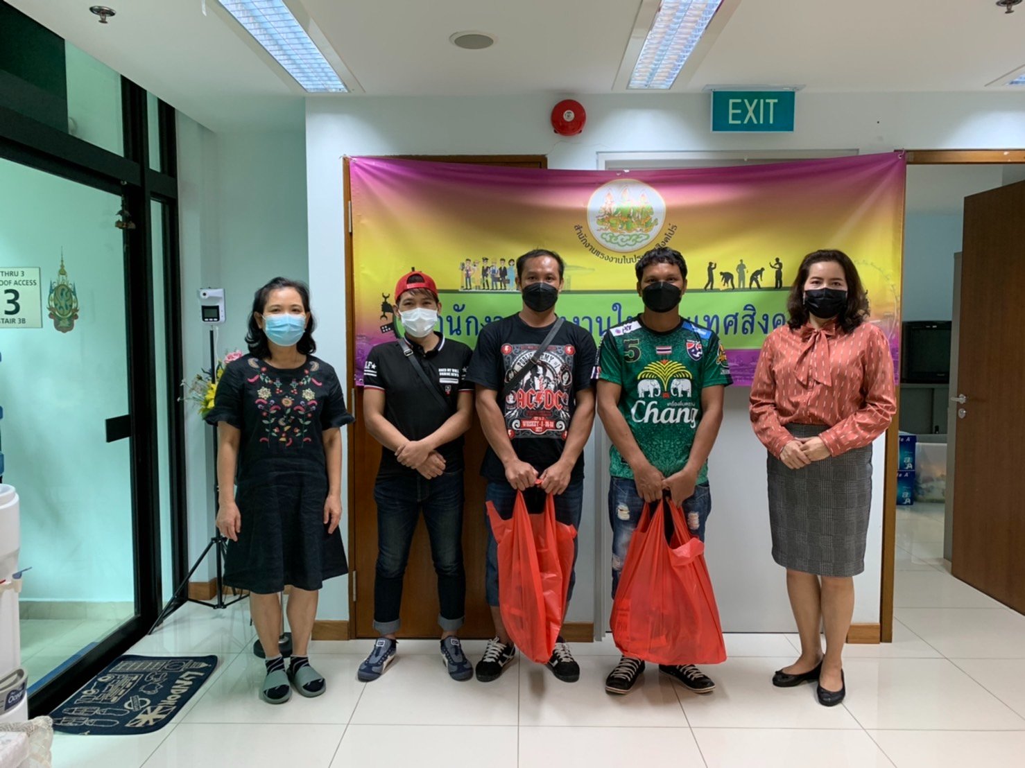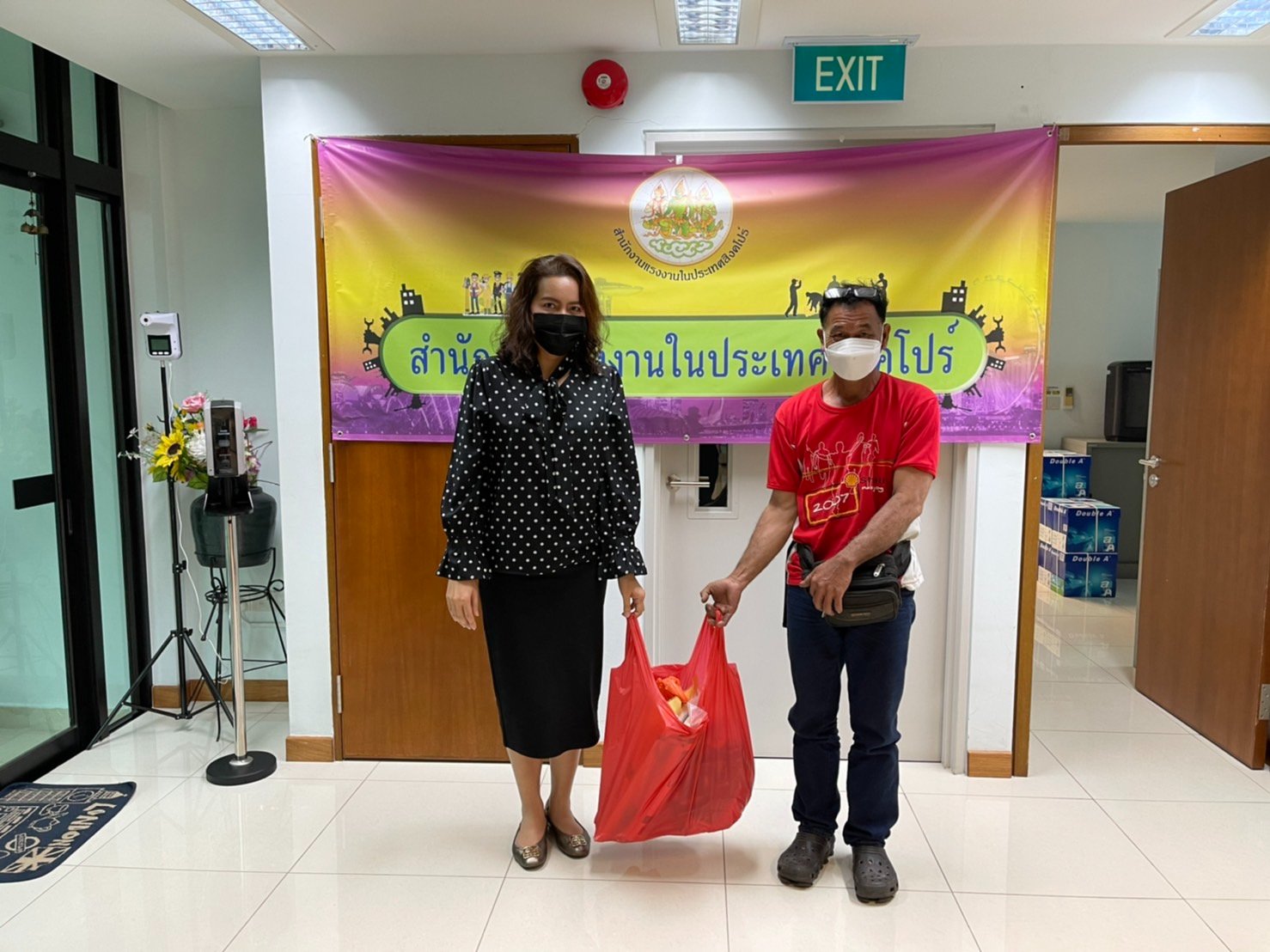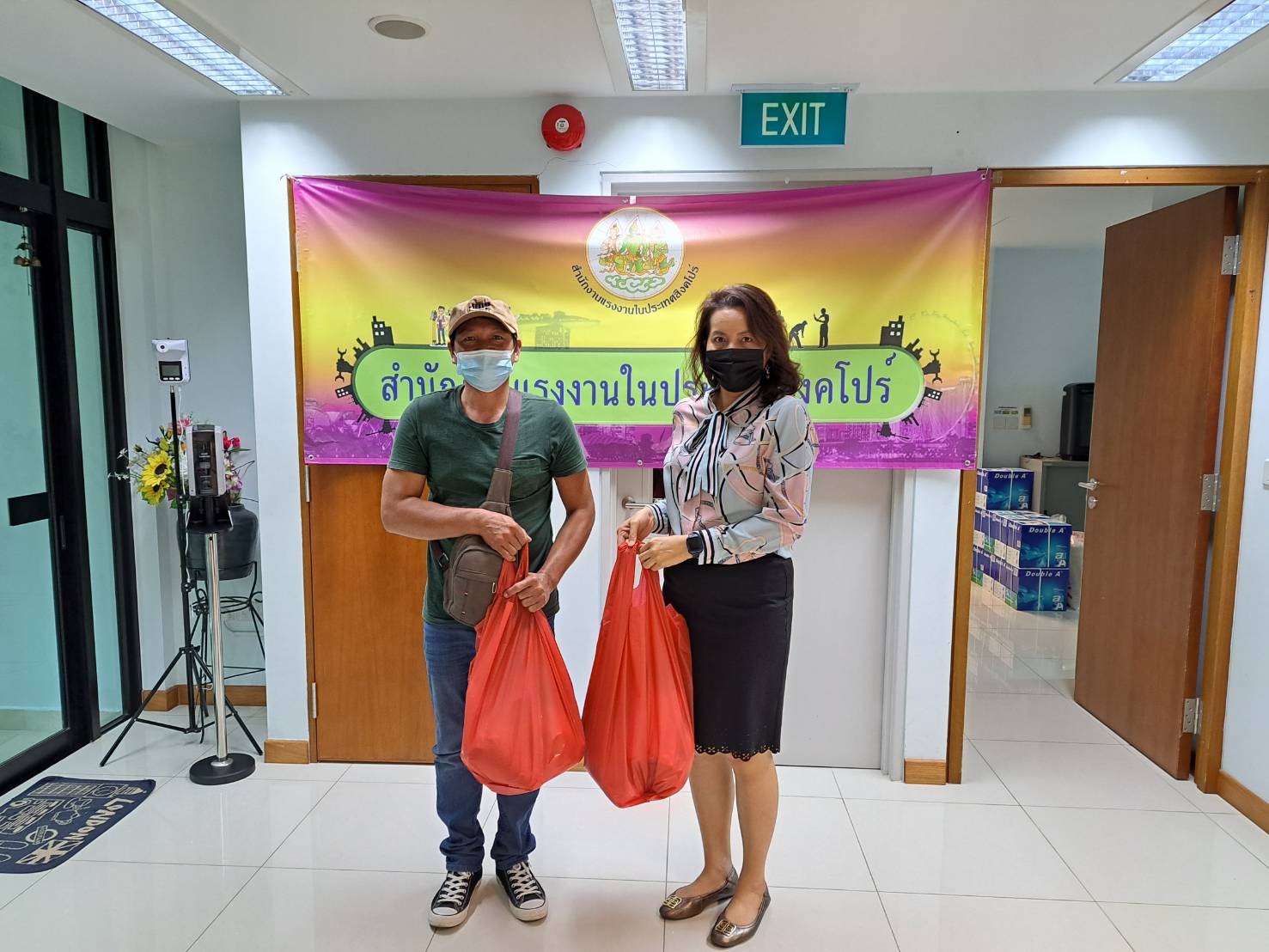 สำนักงานแรงงานในประเทศสิงคโปร์มอบข้าวสาร อาหารแห้ง และสิ่งของจำเป็นให้แก่แรงงานไทยในสิงคโปร์ที่มาติดต่อฝ่ายกงสุล และสำนักงานแรงงานในประเทศสิงคโปร์
