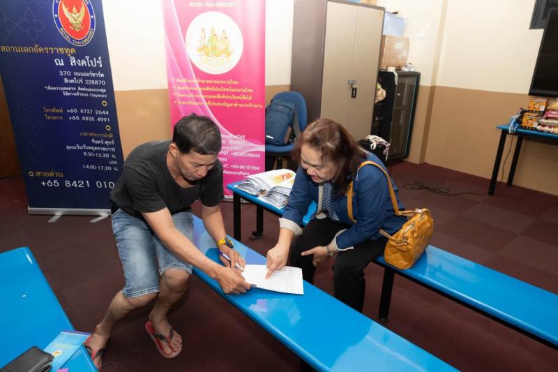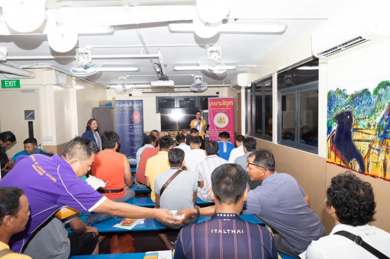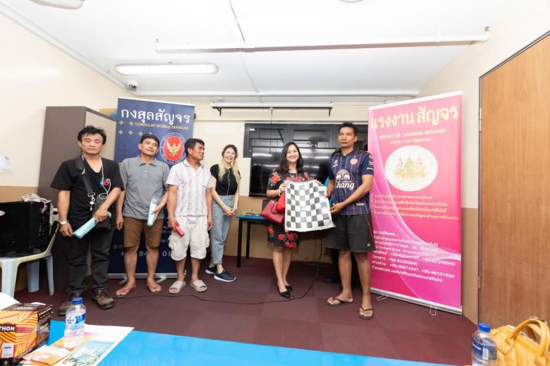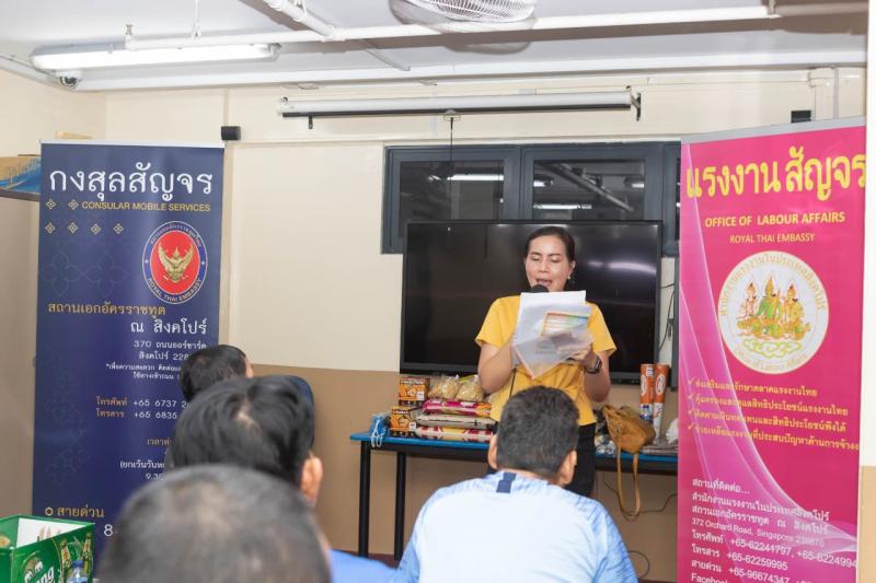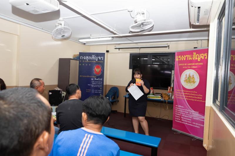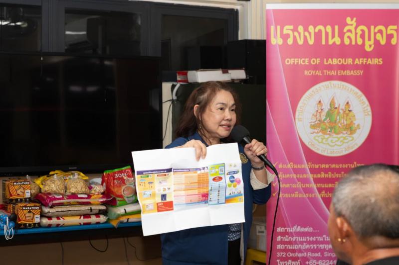 ในการนี้ นางสาวกมลวรรณ บุญยืน อัครราชทูตที่ปรึกษา (ฝ่ายแรงงาน) ได้กล่าวทักทายและให้ความรู้เกี่ยวกับสิทธิประโยชน์ด้านการรักษาพยาบาล การเจ็บป่วยและประสบอันตรายเนื่องจากการทำงานตามกฎหมายของสิงคโปร์ ประชาสัมพันธ์ความรู้เรื่องการประกันสังคมโดยสมัครใจตามมาตรา ๔๐ ความรู้เรื่องหลักประกันสุขภาพแห่งชาติ ข้อแนะนำการดูแลตนเองในช่วงที่มีหมอกควันปกคลุมสิงคโปร์ และมอบหมายให้นางดัชรี คูหาทอง ที่ปรึกษา (ฝ่ายแรงงาน) ให้ความรู้เกี่ยวกับกองทุนช่วยเหลือคนหางานไปทำงานต่างประเทศ นอกจากนี้ ฝ่ายกงสุลฯ ได้ให้ความรู้เกี่ยวกับงานบริการของกงสุล เช่นการทำหนังสือเดินทาง บัตรประจำตัวประชาชน ใบขับขี่รถยนต์ รวมถึงสิทธิและหน้าที่ของคนไทยในสิงคโปร์รวมทั้งแจกคู่มือสำหรับคนไทยในสิงคโปร์ นอกจากนี้สนร.สิงคโปร์ ได้จัดอาหาร น้ำดื่ม บริการชั่งน้ำหนัก วัดความดันโลหิตและแจกแผ่นพับการขอรับสิทธิกรณีเจ็บป่วยจากการทำงาน ช่วงท้ายของการจัดกิจกรรม สนร.สิงคโปร์ และฝ่ายกงสุลฯ ได้ร่วมกันจับฉลากเพื่อมอบอุปกรณ์กีฬา เครื่องอุปโภคบริโภคแก่แรงงานไทย การจัดกิจกรรมดังกล่าวแรงงานไทยรู้สึกดีใจและขอบคุณในความห่วงใยของหน่วยงานราชการไทย และให้ความสนใจสอบถามคำถามในเรื่องต่างๆ มีแรงงานไทยที่เข้าร่วมกิจกรรมในครั้งนี้จำนวน ๔๐ คน สนร.สิงคโปร์ ได้จัดเก็บข้อมูลไว้เพื่อใช้ประโยชน์ต่อไป