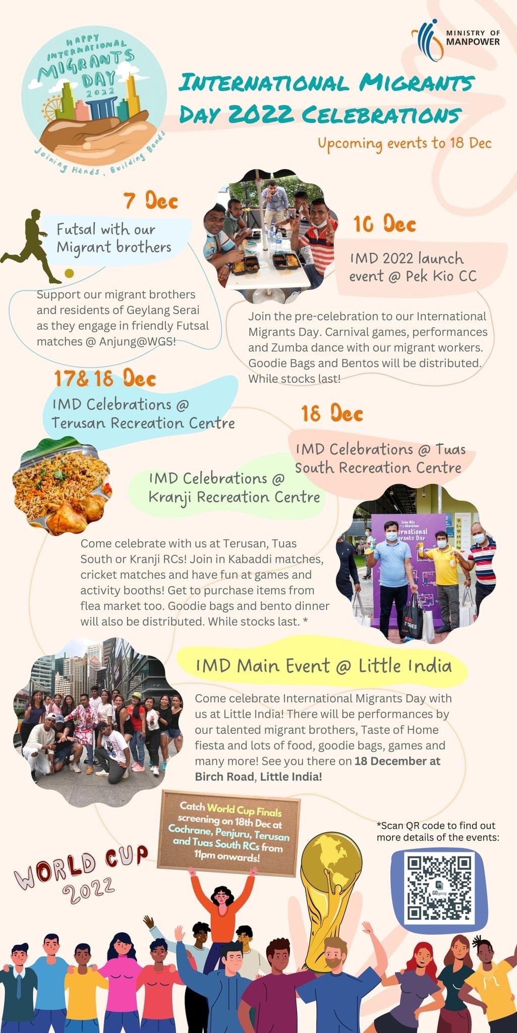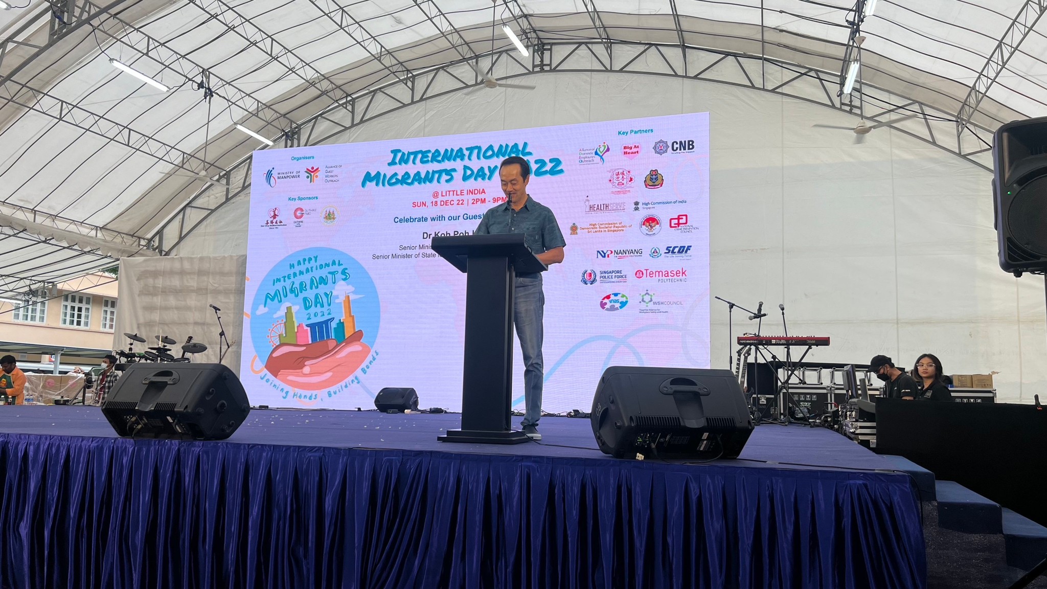 เมื่อวันที่ 18 ธันวาคม 2565 นางดัชรี คูหาทอง ที่ปรึกษา(ฝ่ายแรงงาน)รักษาการในตำแหน่ง อัครราชทูตที่ปรึกษา(ฝ่ายแรงงาน) เข้าร่วมงาน International Migrants Day 2022 ซึ่งจัดขึ้นโดยกระทรวงแรงงานสิงคโปร์และหน่วยงาน The Assurance Care and Engagement Group ทั้งนี้ เพื่อเป็นการเฉลิมฉลองวันแรงงานข้ามชาติสากล (IMD) ร่วมกับแรงงานข้ามชาติ (MWs) งานจัดขึ้นในพื้นที่ Little India (Birch Road) มีการนำอาหารท้องถิ่นจากประเทศต่างๆ การแสดง บูธวัฒนธรรม/เกม และแจกอาหารและขนมให้แก่แรงงานต่างชาติ โดย Dr Koh Poh Koon, Senior Minister of State for Sustainability and the Environment เป็นประธานในพิธีเปิด ในโอกาสนี้ Dr Koh Poh Koon ได้กล่าวขอบคุณ สนร.สิงคโปร์ ที่ได้เข้าร่วมกิจกรรมและบริจาคข้าวสารจำนวน 1,000 กิโลกรัม ให้แก่แรงงานในหอพักต่างๆ ในสิงคโปร์เนื่องในวันแรงงานข้ามสากลด้วย