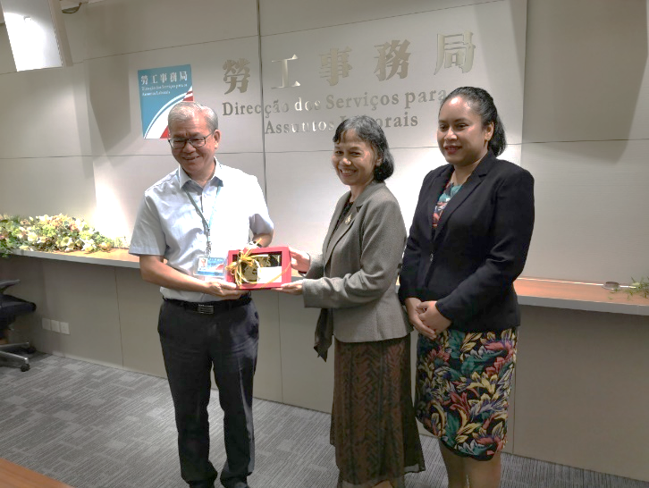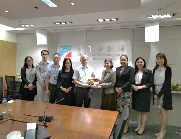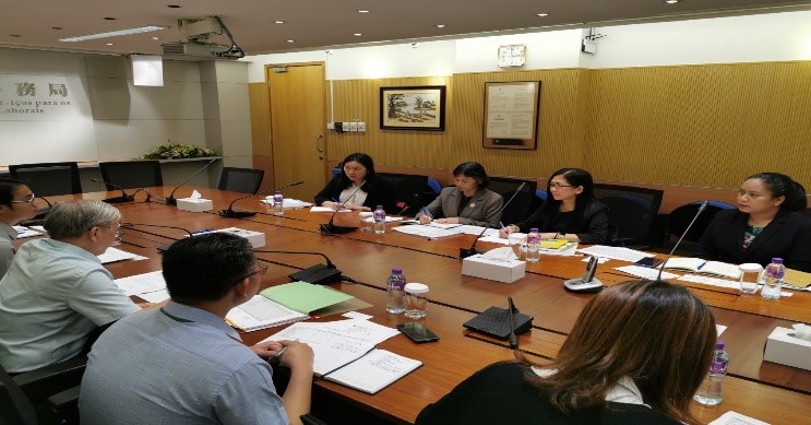 2. เวลา 14.30 น. เข้าเยี่ยมคารวะอธิบดีกรมแรงงาน มาเก๊า Mr. Chi Hong Wong โดยมี Mr. Kenny Kin Lon Lai, Acting Deputy Director. Mr. Kit Wa Choi , Head of Law and Research Division, Miss Weng Chi Chan, Head of Employment Standards and Management Division, Non – resident Workers Employment Department ,Mr. Ip Wai Seng , Acting Functional Head of Public Relations Group และ Miss. Tong Mui Pang, Interpreter of Research and Information Technology เข้าร่วมให้ข้อมูลที่เกี่ยวข้องกับนโยบายการนำเข้าแรงงานต่างชาติ ขั้นตอนการนำเข้าแรงงาน สิทธิประโยชน์แรงงานตามกฏหมายการจ้างงานแรงงานต่างชาติและกฏหมายแรงงานสัมพันธ์ การดำเนินการกรณีแรงงานมีข้อร้องเรียนหรือการเกิดอุบัติเหตุหรือเจ็บป่วยเนื่องในการทำงาน กองทุนช่วยเหลือแรงงานกรณีนายจ้างไม่สามารถจ่ายเงินกรณีเลิกจ้างได้ ฯลฯ รวมถึงให้คำแนะนำแก่แรงงานเช่น ไม่เชื่อคำแอบอ้างใดๆ ในการช่วยให้ได้รับวีฃ่าทำงาน และให้เก็บสัญญาจ้างไว้กับตัวเอง เป็นต้น