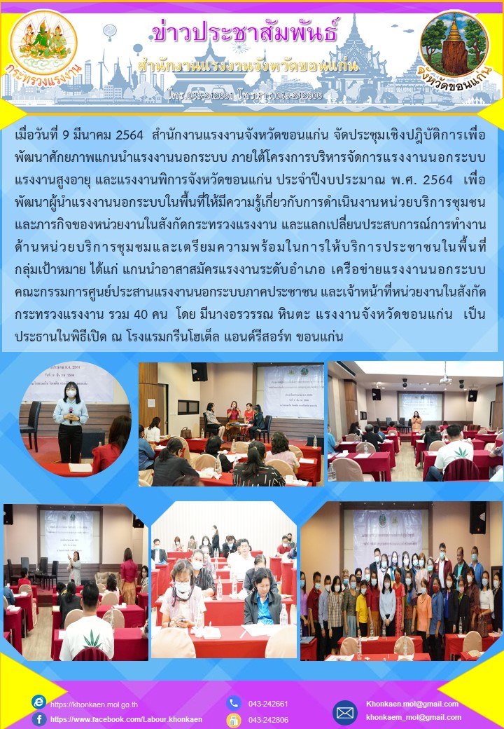 เมื่อวันที่ 9 มีนาคม 2564 สำนักงานแรงานจังหวัดขอบแก่น จัดประชุมเชิงปฏิบัติการเพื่อพัฒนาศักยภาพแกนนำแรงงานนอกระบบ ภายใต้โครงการบริหารจัดการแรงงานนอกระบบแรงงานสูงอายุ และแรงงานพิการจังหวัดขอนแก่น ประจำปีงบประมาณ พ.ศ. 2564 เพื่อพัฒนาผู้นำแรงงานนอกระบบในพื้นที่ให้มีความรู้เกี่ยวกับการดำเนินงานหน่วยบริการชุมชนและภารกิจของหน่วยงานนสังกัดกระทรวงแรงงาน และแลกเปลี่ยนประสบการณ์การทำงานด้านหน่วยบริการชุมชมและเตรียมความพร้อมในการไห้บริการประชาชนในพื้นที่กลุ่มเป้าหมาย ได้แก่ แกนนำอาสาสมัครแรงงานระดับอำเภอ เครือข่ายแรงงานนอกระบบคณะกรรมการศูนย์ประสานแรงงานนอกระบบภาคประชาชน และเจ้าหน้าที่หน่วยงานในสังกัดกระทรวงแรงงาน รวม 40 คน ไดย มีนางอรวรรณ หินตะ แรงงานจังหวัดขอนแก่น เป็นประธานในพิธีเปิด ณ โรงแรมกรีนโฮเต็ล แอนด์รีสอร์ท ขอนแก่น