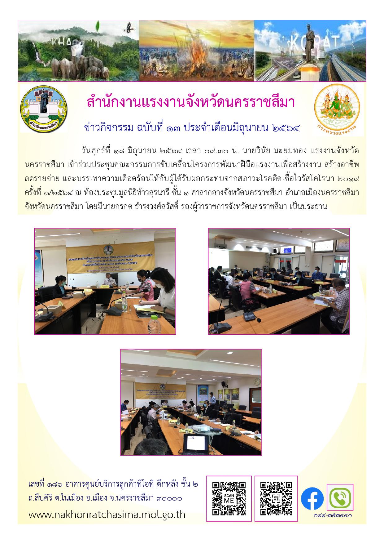 วันศุกร์ที่ 18 มิถุนายน 2564 เวลา 09.30 น. นายวินัย มะยมทอง แรงงานจังหวัดนครราชสีมา เข้าร่วมประชุมคณะกรรมการขับเคลื่อนโครงการพัฒนาฝีมือแรงงานเพื่อสร้างงาน สร้างอาชีพ ลดรายจ่าย และบรรเทาความเดือดร้อนให้กับผู้ได้รับผลกระทบจากสภาวะโรคติดเชื้อไวรัสโคโรนา 2019 ครั้งที่ 1/2564 ณ ห้องประชุมมูลนิธิท้าวสุรนารี ชั้น 1 ศาลากลางจังหวัดนครราชสีมา อำเภอเมืองนครราชสีมา จังหวัดนครราชสีมา โดยมีนายกรกต ธำรงวงศ์สวัสดิ์ รองผู้ว่าราชการจังหวัดนครราชสีมา เป็นประธาน