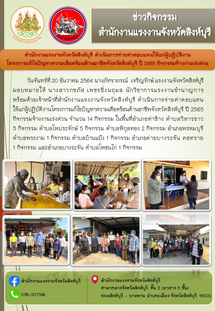 สำนักงาานแรงงานจังหวัดสิงห์บุรี ดำเนินการจ่ายค่าตอบแทนให้แก่ผู้ปฎิบัติงานโครงการแก้ไขปัญหาความเดือดร้อนด้านอาชีพจังหวัดสิงห์บุรี ปี 2565 กิจกรรมจ้างงานเร่งด่วน