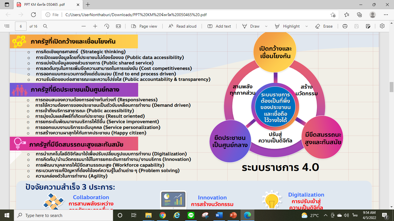 วันที่ 5 เมษายน 2565 เวลา 9.30 น. นายวิชิตร สุวรรณมาก แรงงานจังหวัดนนทบุรี มอบหมายให้ นางสาวโสภิตา อินทรีย์วงศ์ นักวิชาการแรงงานชำนาญการ ร่วมรับฟังกิจกรรมเสวนา KM Online หัวข้อ “เคล็ด (ไม่) ลับกับการเป็นจังหวัด 4.0”เพื่อส่งเสริมให้หน่วยงานในจังหวัดมีการพัฒนาและยกระดับการบริหารจัดการที่สอดคล้องกับแนวทางกรอบการประเมินศักยภาพในการดำเนินงาน (potential base) ที่สำนักงาน ก.พ.ร. กำหนดและเป็นไปตามเกณฑ์คุณภาพการบริหารจัดการภาครัฐควบคู่กับการรักษามาตรฐานการเป็นระบบราชการ 4.0 ตามแนวทางการพัฒนาประเทศเทียบเท่ามาตรฐานสากล มีการทำงานร่วมกับภาคีเครือข่ายการประสานงานผ่านเครือข่ายทุกระดับ ในการขับเคลื่อนงานเพื่อนำนโยบาย สู่การปฏิบัติ รวมไปถึงการนำเครือข่าย ทุกภาคส่วนมาร่วมสร้างนวัตกรรม ผ่านระบบ Youtube Live โดยสำนักงานคณะกรรมการพัฒนาระบบราชการ