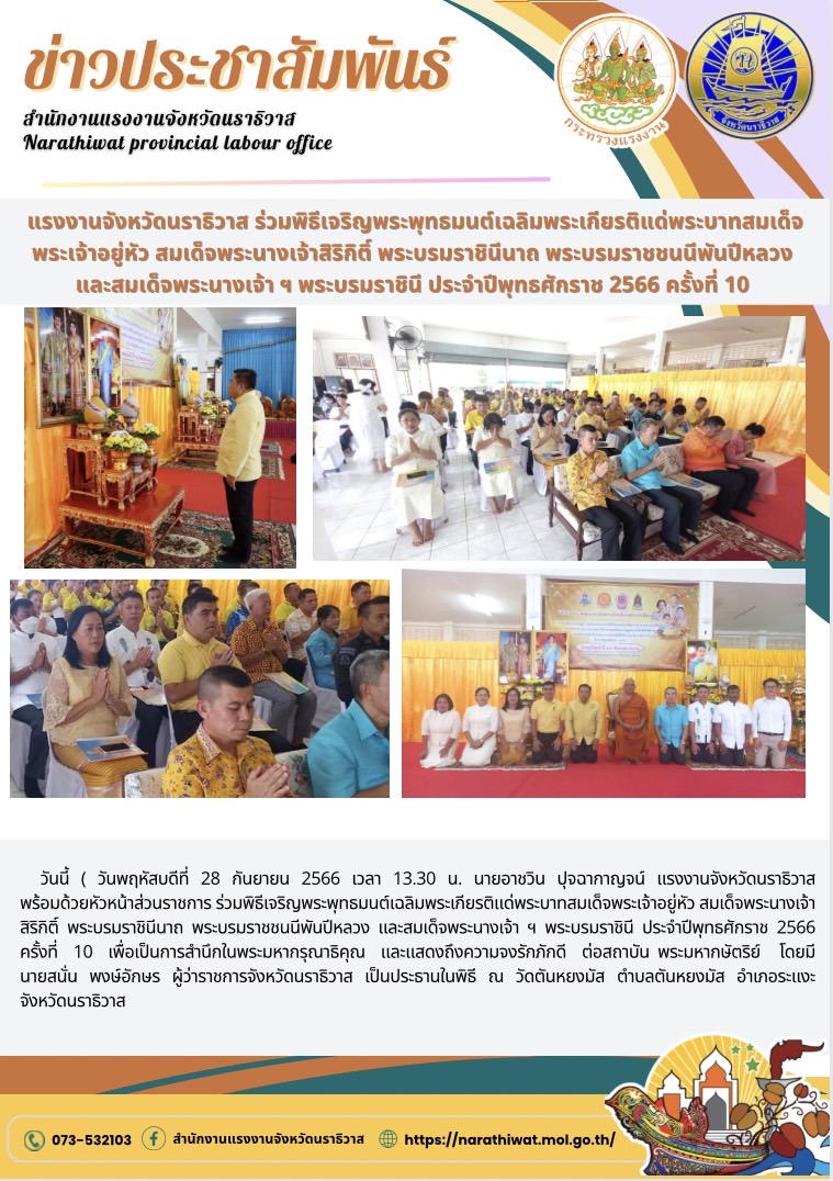 วันนี้ ( วันพฤหัสบดีที่ 28 กันยายน 2566 เวลา 13.30 น. นายอาชวิน ปุจฉากาญจน์ แรงงานจังหวัดนราธิวาส พร้อมด้วยหัวหน้าส่วนราชการ ร่วมพิธีเจริญพระพุทธมนต์เฉลิมพระเกียรติแด่พระบาทสมเด็จพระเจ้าอยู่หัว สมเด็จพระนางเจ้าสิริกิติ์ พระบรมราชินีนาถ พระบรมราชชนนีพันปีหลวง และสมเด็จพระนางเจ้า ฯ พระบรมราชินี ประจำปีพุทธศักราช 2566 ครั้งที่ 10 เพื่อเป็นการสำนึกในพระมหากรุณาธิคุณ และแสดงถึงความจงรักภักดี ต่อสถาบัน พระมหากษัตริย์ โดยมี นายสนั่น พงษ์อักษร ผู้ว่าราชการจังหวัดนราธิวาส เป็นประธานในพิธี ณ วัดตันหยงมัส ตำบลตันหยงมัส อำเภอระแงะ จังหวัดนราธิวาส