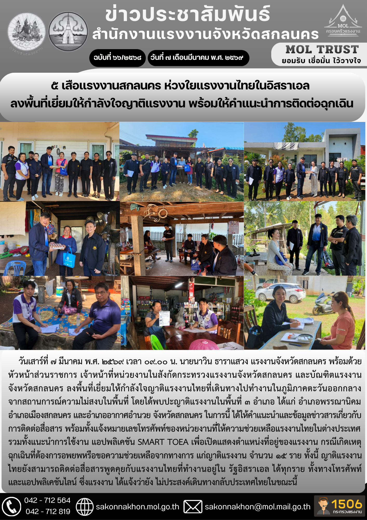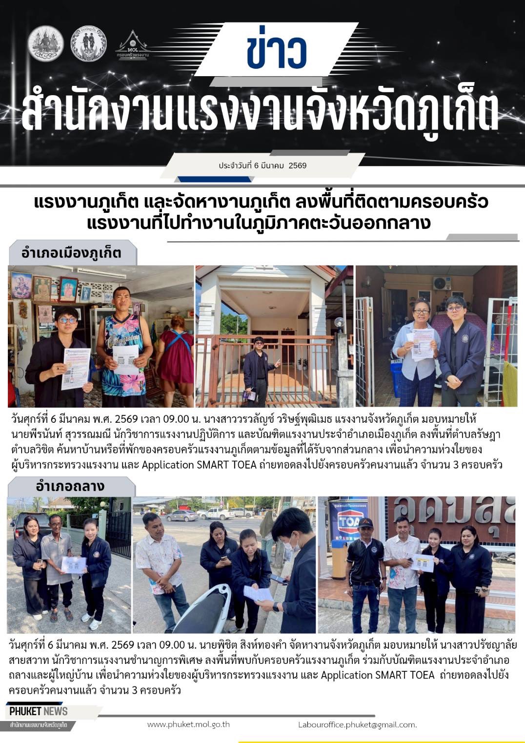 วันที่ ๑๙ พ.ย.๖๐ เวลา ๑๖๐๐ น.ณ เดอะสแควร์ บางใหญ่ จังหวัดนนทบุรี : หัวหน้าส่วนราชการในสังกัดกระทรวงแรงงานจังหวัดนนทบุรีทั้ง ๕ หน่วยงาน ได้ร่วมกันให้การต้อนรับนายอนุรักษ์ ทศรัตน์ อธิบดีกรมการจัดหางาน และอธิบดีแรงงานประเทศเมียนม่า พร้อมคณะ ซึ่งได้เดินทางมาตรวจเยี่ยมศูนย์บริการเพื่อการทำงานของคนต่างด้าวสัญชาติเมียนมา เพื่อติดตามความก้าวหน้าในการทำงานและตรวจสอบกระบวนการตรวจพิสูจน์สัญชาติให้เป็นไปด้วยความเรียบร้อยและเสร็จสิ้นภายในระยะเวลาที่กำหนด โดยจุดประสงค์เพื่อให้แรงงานเมียนมาที่เข้ามาทำงานในประเทศไทยได้รับอนุญาตให้ทำงานถูกต้องตามกฎหมาย โดยกำหนดให้มีการพิสูจน์สัญชาติได้วันละ ๑๐๐-๒๐๐ คน ซึ่งอธิบดีแรงงานเมียนมาได้ร้องขอให้ทางกรม การจัดหางานเร่งการพิสูจน์สัญชาติให้ได้เพิ่มขึ้นเป็นวันละ ๕๐๐ คน ทั้งนี้ อธิบดีกรมการจัดหางานก็ได้ตอบรับว่าจะดำเนินการตามข้อหารือดังกล่าว และเน้นย้ำให้เจ้าหน้าที่/หน่วยงานที่เกี่ยวข้องปฏิบัติงานอย่างเต็มกำลังความสามารถด้วยความซื่อสัตย์สุจริต โปร่งใส และเป็นธรรม เพื่อให้เกิดประโยชน์สูงสุดแก่ทุกฝ่ายที่เกี่ยวข้อง
