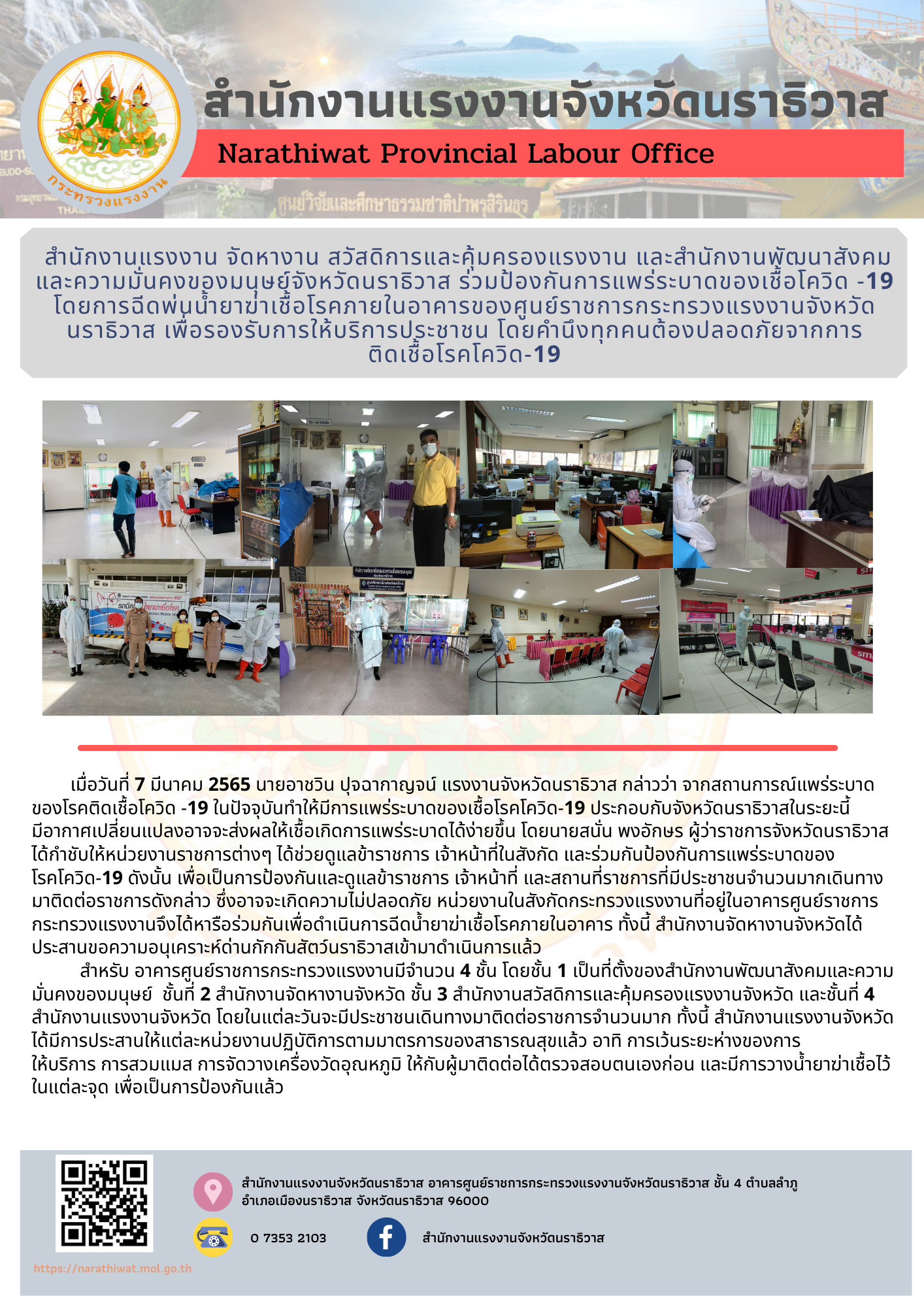 เมื่อวันที่ 7 มีนาคม 2565 นายอาชวิน ปุจฉากาญจน์ แรงงานจังหวัดนราธิวาส กล่าวว่า จากสถานการณ์แพร่ระบาดของโรคติดเชื้อโควิด -19 ในปัจจุบันทำให้มีการแพร่ระบาดของเชื้อโรคโควิด-19 ประกอบกับจังหวัดนราธิวาสในระยะนี้มีอากาศเปลี่ยนแปลงอาจจะส่งผลให้เชื้อเกิดการแพร่ระบาดได้ง่ายขึ้น โดยนายสนั่น พงอักษร ผู้ว่าราชการจังหวัดนราธิวาสได้กำชับให้หน่วยงานราชการต่างๆ ได้ช่วยดูแลข้าราชการ เจ้าหน้าที่ในสังกัด และร่วมกันป้องกันการแพร่ระบาดของโรคโควิด-19 ดังนั้น เพื่อเป็นการป้องกันและดูแลข้าราชการ เจ้าหน้าที่ และสถานที่ราชการที่มีประชาชนจำนวนมากเดินทางมาติดต่อราชการดังกล่าว ซึ่งอาจจะเกิดความไม่ปลอดภัย หน่วยงานในสังกัดกระทรวงแรงงานที่อยู่ในอาคารศูนย์ราชการกระทรวงแรงงานจึงได้หารือร่วมกันเพื่อดำเนินการฉีดน้ำยาฆ่าเชื้อโรคภายในอาคาร ทั้งนี้ สำนักงานจัดหางานจังหวัดได้ประสานขอความอนุเคราะห์ด่านกักกันสัตว์นราธิวาสเข้ามาดำเนินการแล้วสำหรับ อาคารศูนย์ราชการกระทรวงแรงงานมีจำนวน 4 ชั้น โดยชั้น 1 เป็นที่ตั้งของสำนักงานพัฒนาสังคมและความมั่นคงของมนุษย์ ชั้นที่ 2 สำนักงานจัดหางานจังหวัด ชั้น 3 สำนักงานสวัสดิการและคุ้มครองแรงงานจังหวัด และชั้นที่ 4 สำนักงานแรงงานจังหวัด โดยในแต่ละวันจะมีประชาชนเดินทางมาติดต่อราชการจำนวนมาก ทั้งนี้ สำนักงานแรงงานจังหวัดได้มีการประสานให้แต่ละหน่วยงานปฏิบัติการตามมาตรการของสาธารณสุขแล้ว อาทิ การเว้นระยะห่างของการให้บริการ การสวมแมส การจัดวางเครื่องวัดอุณหภูมิ ให้กับผู้มาติดต่อได้ตรวจสอบตนเองก่อน และมีการวางน้ำยาฆ่าเชื้อไว้ในแต่ละจุด เพื่อเป็นการป้องกันแล้ว