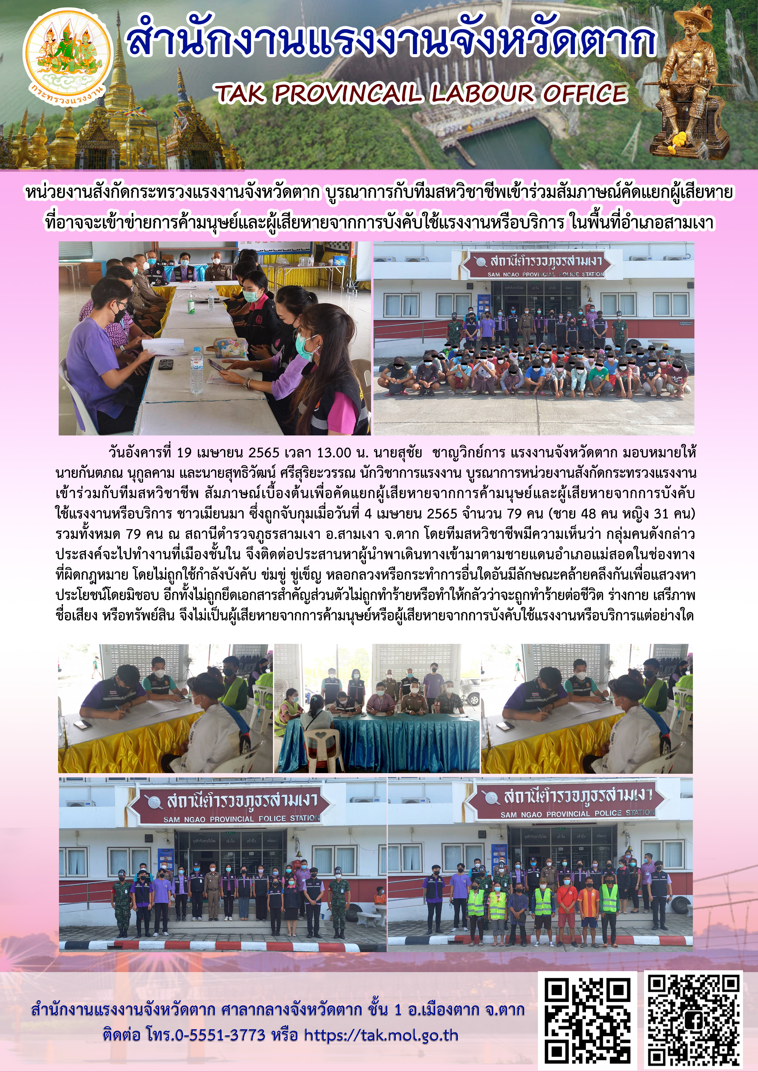 หน่วยงานสังกัดกระทรวงแรงงานจังหวัดตาก บูรณาการกับทีมสหวิชาชีพเข้าร่วมสัมภาษณ์คัดแยกผู้เสียหายที่อาจจะเข้าข่ายการค้ามนุษย์และผู้เสียหายจากการบังคับใช้แรงงานหรือบริการ ในพื้นที่อำเภอสามเงา