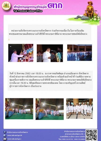 หน่วยงานสังกัดกระทรวงแรงงานจังหวัดตาก ร่วมกิจกรรมเนื่องในโอกาสวันเฉลิมพระชนมพรรษา สมเด็จพระนางเจ้าสิริกิติ์ พระบรมราชินีนาถ พระบรมราชชนนีพันปีหลวง