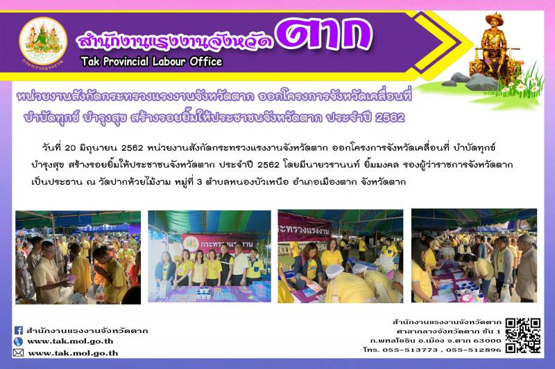 หน่วยงานสังกัดกระทรวงแรงงานจังหวัดตาก ออกโครงการจังหวัดเคลื่อนที่ บำบัดทุกข์ บำรุงสุข สร้างรอยยิ้มให้ประชาชนจังหวัดตาก ประจำปี 2562