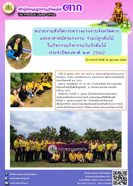 หน่วยงานสังกัดกระทรวงแรงงานจังหวัดตาก และอาสาสมัครแรงงาน ร่วมปลูกต้นไม้ในกิจกรรม กิจกรรมวันรักต้นไม้ ประจำของชาติ พ.ศ. 2562