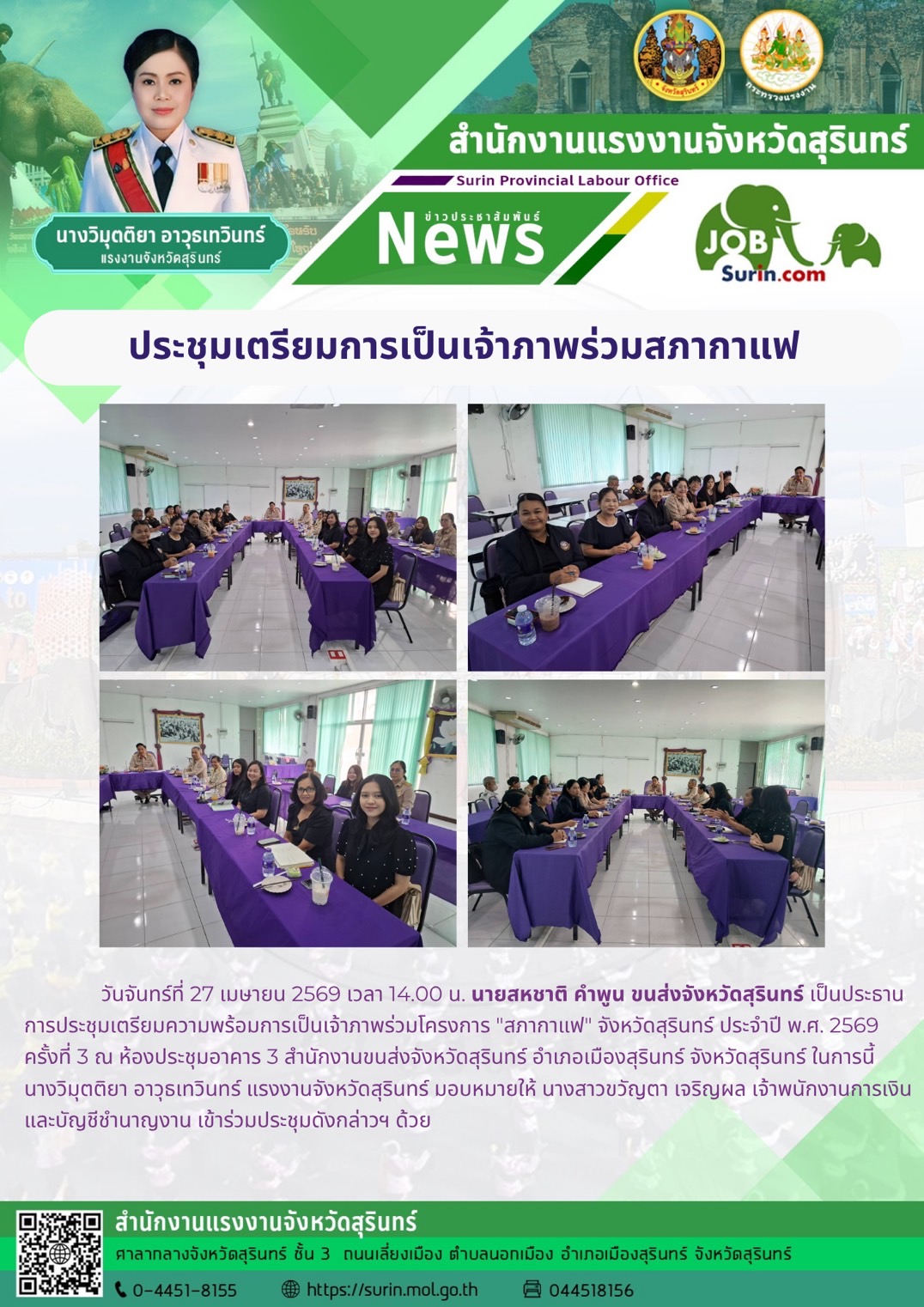 แรงงานจังหวัดสุรินทร์ ประชุมเตรียมการเป็นเจ้าภาพร่วมสภากาแฟ