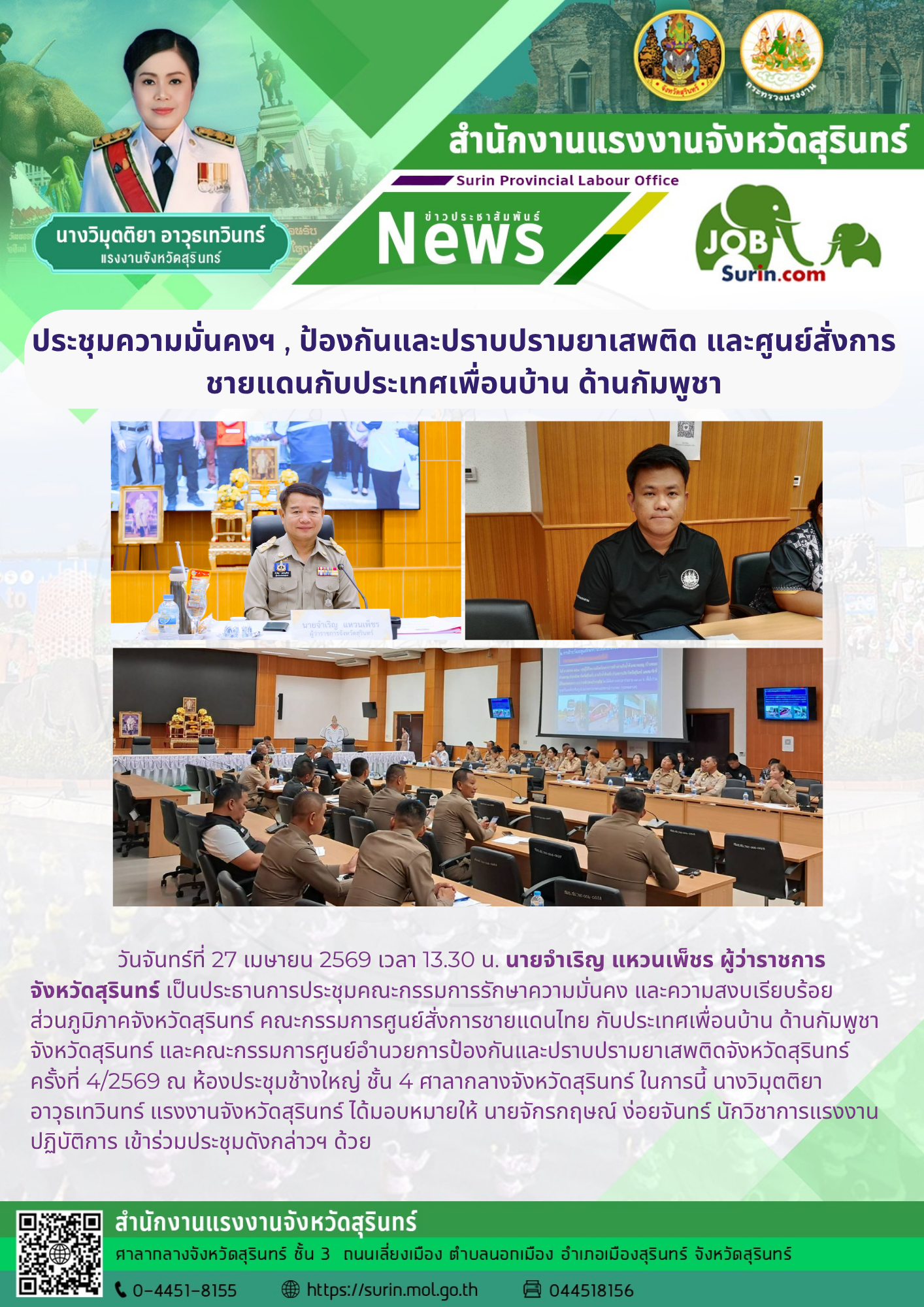 แรงงานจังหวัดสุรินทร์ ประชุมความมั่นคงฯ , ป้องกันและปราบปรามยาเสพติด และศูนย์สั่งการชายแดนกับประเทศเพื่อนบ้าน ด้านกัมพูชา