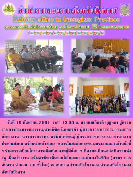 หน่วยงานสังกัดกระทรวงแรงงานจังหวัดบึงกาฬร่วมออกตรวจเยี่ยมการฝึกอาชีพโครงการเพิ่มศักยภาพผู้มีรายได้ (สาขาการจักสาน)