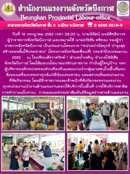 หน่วยงานสังกัดกระทรวงแรงงานจังหวัดบึงกาฬ ร่วมโครงการหน่วยบำบัดทุกข์ บำรุงสุข สร้างรอยยิ้มให้ประชาชน พื้นที่อำเภอโซ่พิสัย