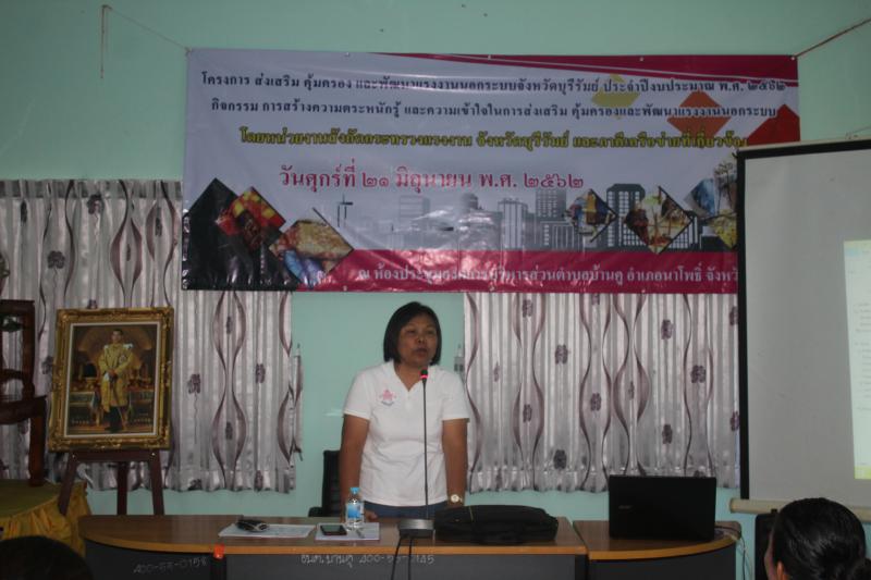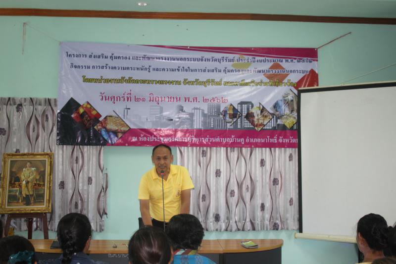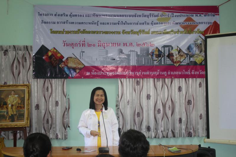 วันที่ ๒๑ มิถุนายน ๒๕๖๒ เวลา ๑๐.๐๐ น. หน่วยงานสังกัดกระทรวงแรงงานจังหวัดบุรีรัมย์ จัดอบรมโครงการส่งเสริม คุ้มครองและพัฒนาแรงงานนอกระบบจังหวัดบุรีรัมย์ ประจำปีงบประมาณ ๒๕๖๒ โดยมีวัตถุประสงค์ในการสร้างความตระหนักรู้และความเข้าใจในการส่งเสริม คุ้มครองและพัฒนาแรงงานนอกระบบ เพื่อให้แรงงานอกระบบ “กลุ่มทอผ้าไหม” มีความรู้เรื่องสุขภาวะอนามัยและความปลอดภัยในการทำงาน โดยเน้นการบริหารจัดการ การกำจัดและบำบัดสารเคมีจากการฟอกย้อมผ้าไหมสีสังเคราะห์ ณ ห้องประชุมองค์การบริหารส่วนตำบลบ้านคู อำเภอนาโพธิ์ จังหวัดบุรีรัมย์ โดยมีนายพิจิตร บุญทัน รองผู้ว่าราชการจังหวัดบุรีรัมย์ เป็นประธาน