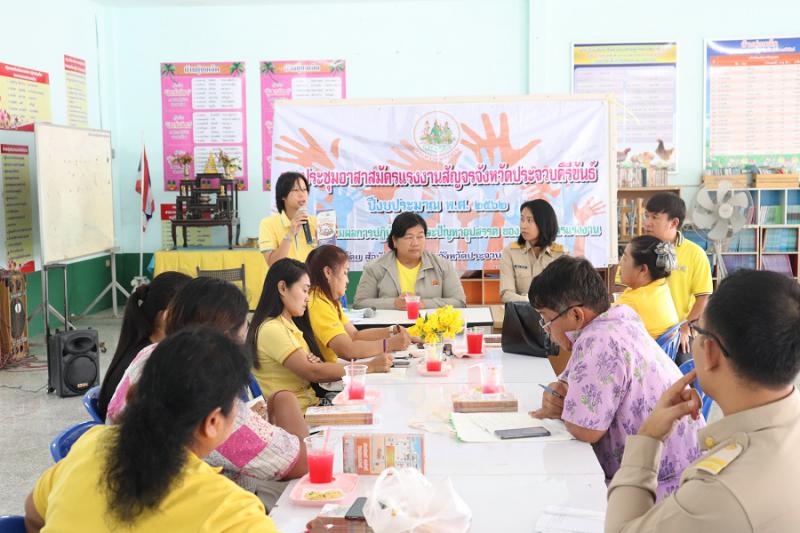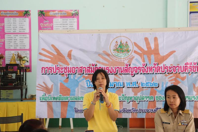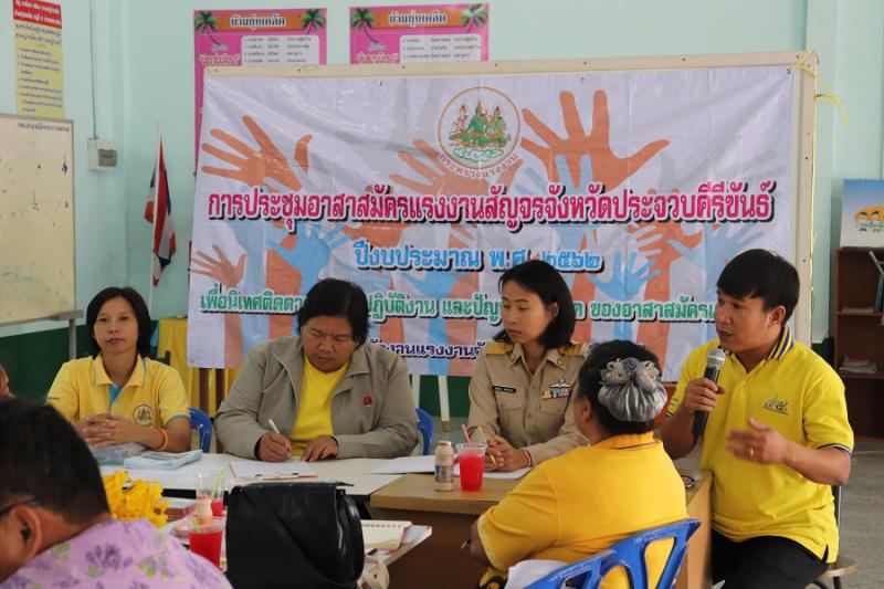 วันที่ 13 พฤษภาคม 2562 นางสาวมยุรี อินต๊ะมา นักวิชาการแรงงานชำนาญการ รักษาราชการแทนแรงงานจังหวัดประจวบคีรีขันธ์ พร้อมด้วยพี่เลี้ยงอาสาสมัครแรงงาน ออกตรวจนิเทศการปฏิบัติงานของอาสาสมัครแรงงานและเครือข่ายด้านแรงงาน ตามโครงการประชุมอาสาสมัครแรงงานสัญจรจังหวัดประจวบคีรีขันธ์ ประจำปีงบประมาณ พ.ศ. 2562 เพื่อติดตามผลการปฏิบัติงาน พร้อมทั้งรับฟังปัญหาอุปสรรคในการปฏิบัติงานของอาสาสมัครแรงงานในพื้นที่อำเภอเมือง ณ ศาลาหมู่บ้าน บ้านทุ่งเคล็ด หมู่ 6 ตำบลเกาะหลัก อำเภอเมือง จังหวัดประจวบคีรีขันธ์ ทั้งนี้ หน่วยงานในสังกัดกระทรวงแรงงานได้ชี้แจงภารกิจของแต่ละหน่วยงานให้ผู้ร่วมประชุมทราบ