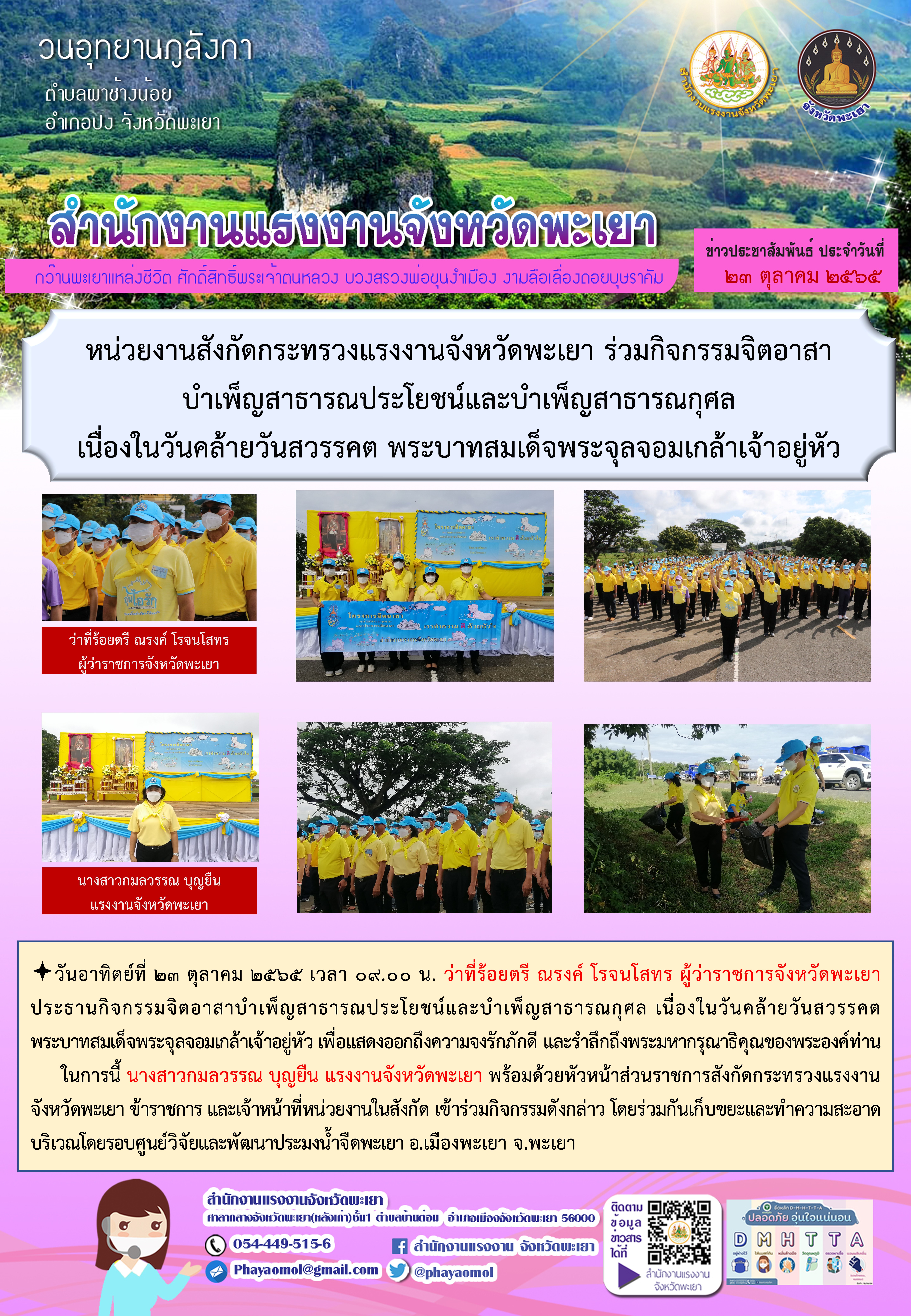 หน่วยงานสังกัดกระทรวงแรงงานจังหวัดพะเยา ร่วมกิจกรรมจิตอาสาบำเพ็ญสาธารณประโยชน์และบำเพ็ญสาธารณกุศล เนื่องในวันคล้ายวันสวรรคต พระบาทสมเด็จพระจุลจอมเกล้าเจ้าอยู่หัว