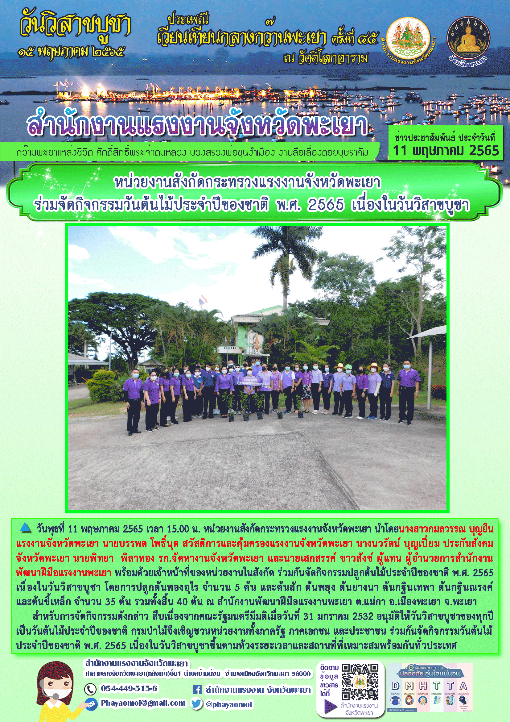 หน่วยงานสังกัดกระทรวงแรงงานจังหวัดพะเยา ร่วมจัดกิจกรรมวันต้นไม้ประจำปีของชาติ พ.ศ. 2565 เนื่องในวันวิสาขบูชา