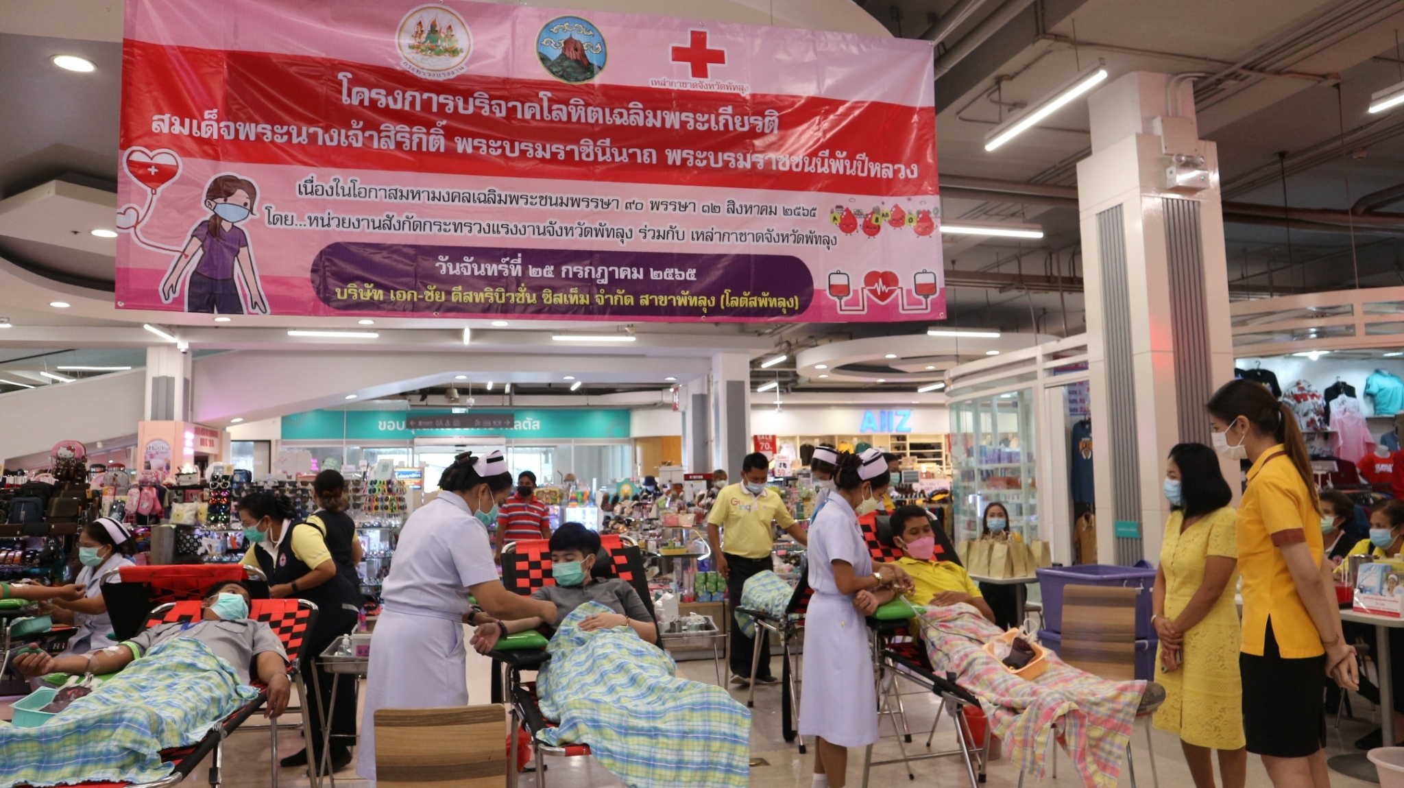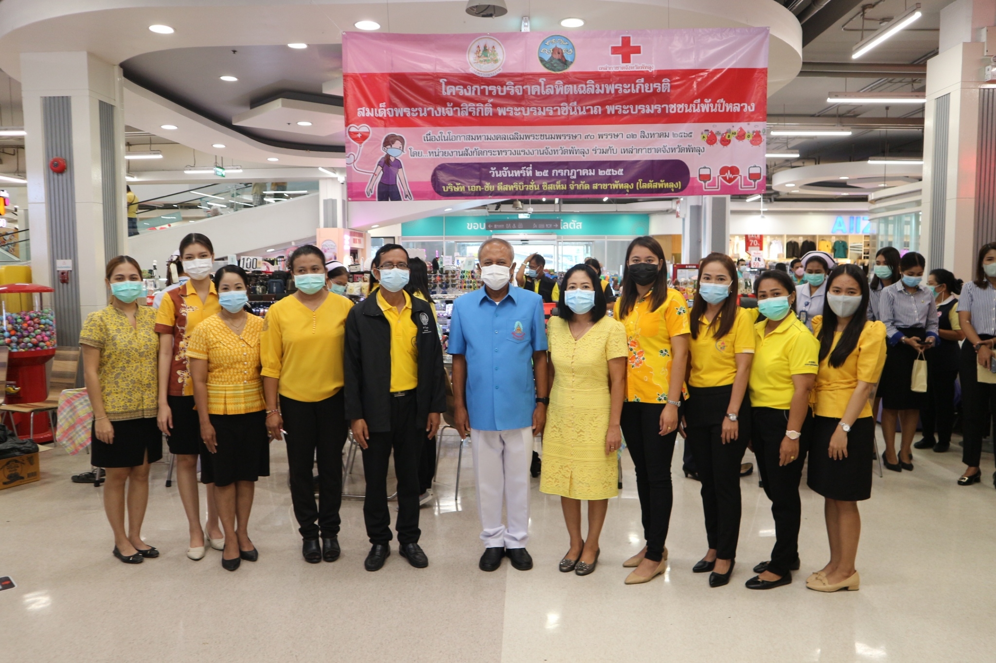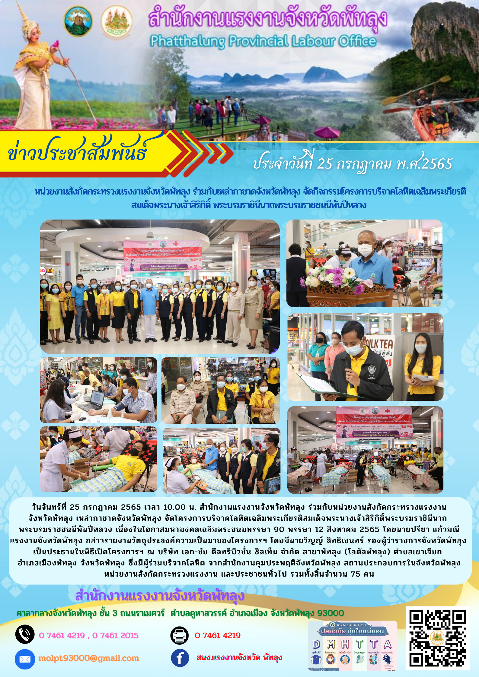 วันจันทร์ที่ 25 กรกฏาคม 2565 เวลา 10.00 น. สำนักงานแรงงานจังหวัดพัทลุง ร่วมกับหน่วยงานสังกัดกระทรวงแรงงานจังหวัดพัทลุง เหล่ากาชาดจังหวัดพัทลุง จัดโครงการบริจาคโลหิตเฉลิมพระเกียรติสมเด็จพระนางเจ้าสิริกิติ์พระบรมราชินีนาถ พระบรมราชชนนีพันปีหลวง เนื่องในโอกาสมหามงคลเฉลิมพระชนมพรรษา 90 พรรษา 12 สิงหาคม 2565 โดยนายปรีชา แก้วมณี แรงงานจังหวัดพัทลุง กล่าวรายงานวัตถุประสงค์ความเป็นมาของโครงการฯ โดยมีนายวิญญ์ สิทธิเชนทร์ รองผู้ว่าราชการจังหวัดพัทลุง เป็นประธานในพิธีเปิดโครงการฯ ณ บริษัท เอก-ชัย ดีสทริบิวชั่น ซิสเท็ม จำกัด สาขาพัทลุง (โลตัสพัทลุง) ตำบลเขาเจียก อำเภอเมืองพัทลุง จังหวัดพัทลุง ซึ่งมีผู้ร่วมบริจาคโลหิต จากสำนักงานคุมประพฤติจังหวัดพัทลุง สถานประกอบการในจังหวัดพัทลุง หน่วยงานสังกัดกระทรวงแรงงาน และประชาชนทั่วไป รวมทั้งสิ้นจำนวน 75 คน