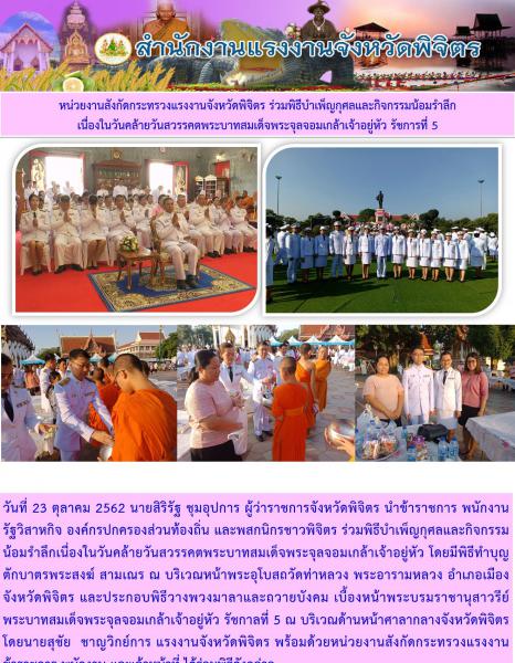 หน่วยงานสังกัดกระทรวงแรงงานจังหวัดพิจิตร ร่วมพิธีบำเพ็ญกุศลและกิจกรรมน้อมรำลึก เนื่องในวันคล้ายวันสวรรคตพระบาทสมเด็จพระจุลจอมเกล้าเจ้าอยู่หัว รัชการที่ 5