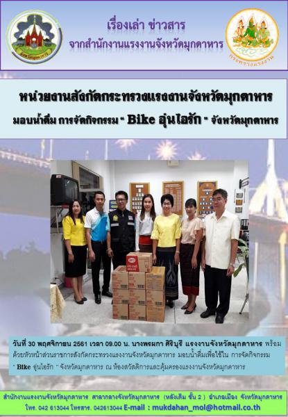 หน่วยงานสังกัดกระทรวงแรงงานจังหวัดมุกดาหาร มอบน้ำดื่ม การจัดกิจกรรม “ Bike อุ่นไอรัก ” จังหวัดมุกดาหาร
