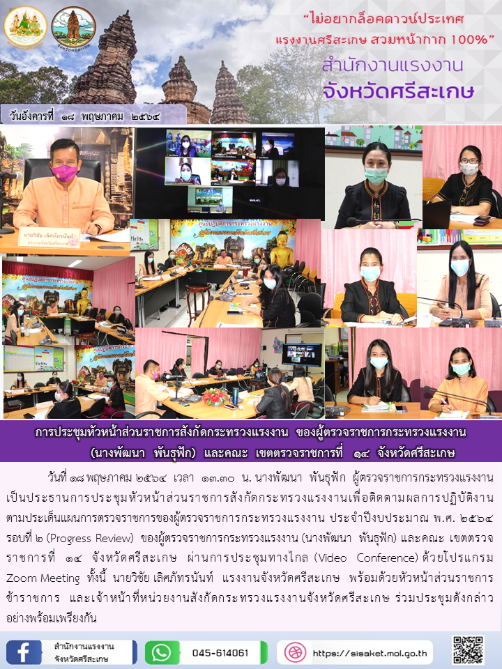 วันที่ 18 พฤษภาคม 2564 เวลา 13.30 น. นางพัฒนา พันธุฟัก ผู้ตรวจราชการกระทรวงแรงงาน เป็นประธานการประชุมหัวหน้าส่วนราชการสังกัดกระทรวงแรงงานเพื่อติดตามผลการปฏิบัติงานตามประเด็นแผนการตรวจราชการของผู้ตรวจราชการกระทรวงแรงงาน ประจำปีงบประมาณ พ.ศ. 2564รอบที่ ๒ (Progress Review) ของผู้ตรวจราชการกระทรวงแรงงาน (นางพัฒนา พันธุฟัก) และคณะ เขตตรวจราชการที่ 14 จังหวัดศรีสะเกษ ผ่านการประชุมทางไกล (Video Conference) ด้วยโปรแกรมZoom Meeting ทั้งนี้ นายวิชัย เลิศภัทรนันท์ แรงงานจังหวัดศรีสะเกษ พร้อมด้วยหัวหน้าส่วนราชการ ข้าราชการ และเจ้าหน้าที่หน่วยงานสังกัดกระทรวงแรงงานจังหวัดศรีสะเกษ ร่วมประชุมดังกล่าวอย่างพร้อมเพรียงกัน