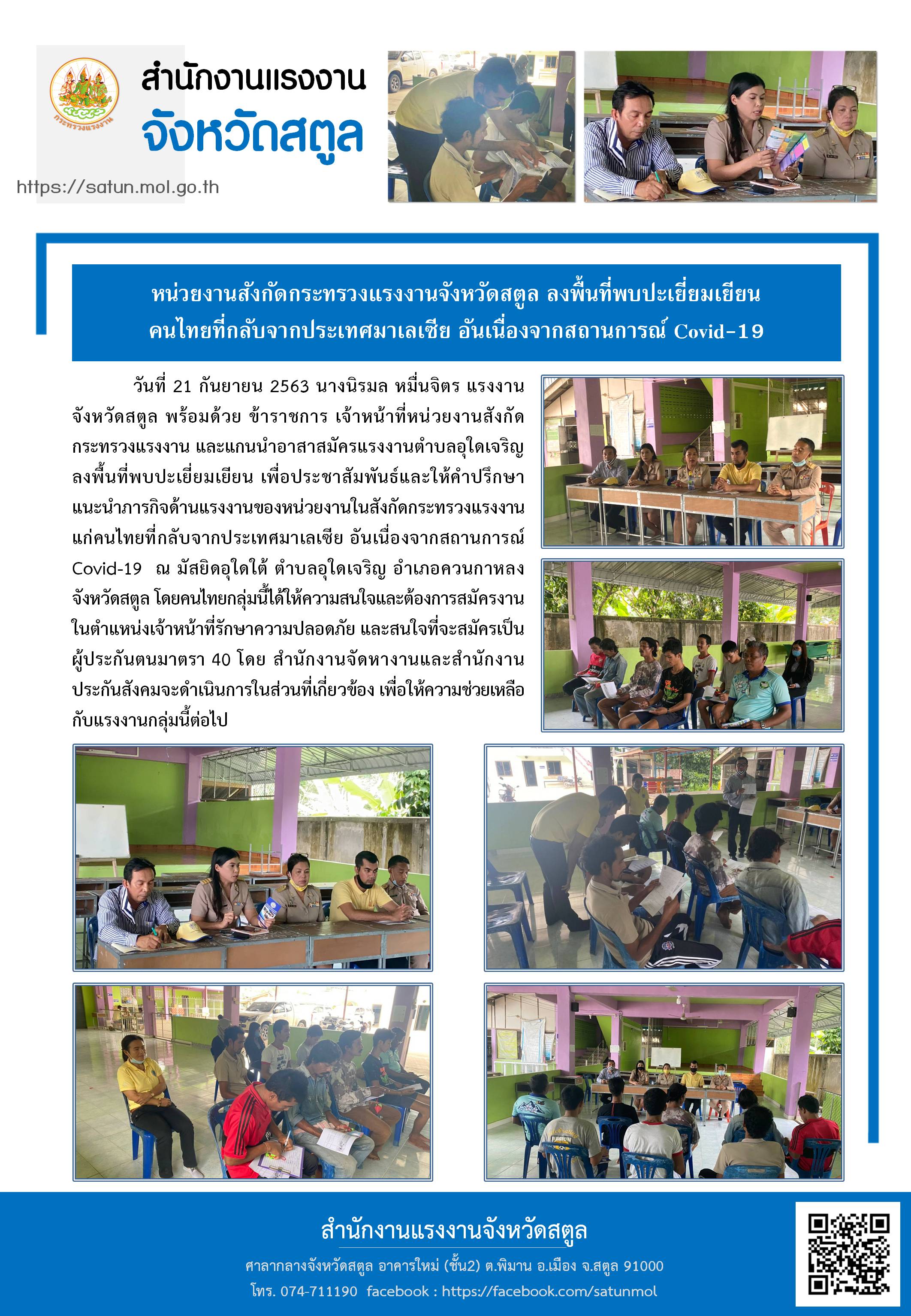 หน่วยงานสังกัดกระทรวงแรงงานจังหวัดสตูล ลงพื้นที่พบปะเยี่ยมเยียนคนไทยที่กลับจากประเทศมาเลเซีย อันเนื่องจากสถานการณ์ Covid-19
