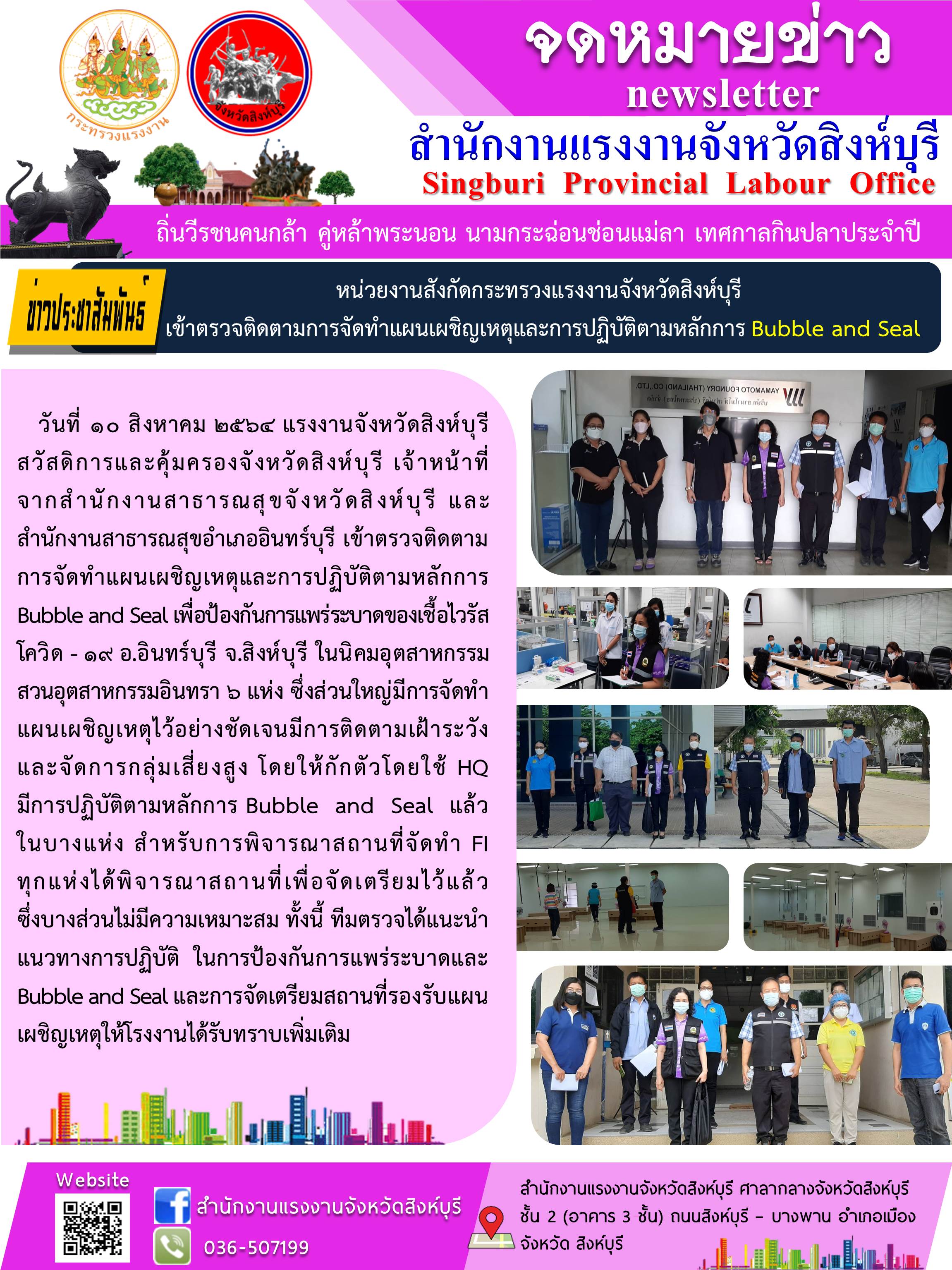 หน่วยงานสังกัดกระทรวงแรงงานจังหวัดสิงห์บุรี เข้าตรวจติดตามการจัดทำแผนเผชิญเหตุและการปฏิบัติตามหลักการ Bubble and Seal