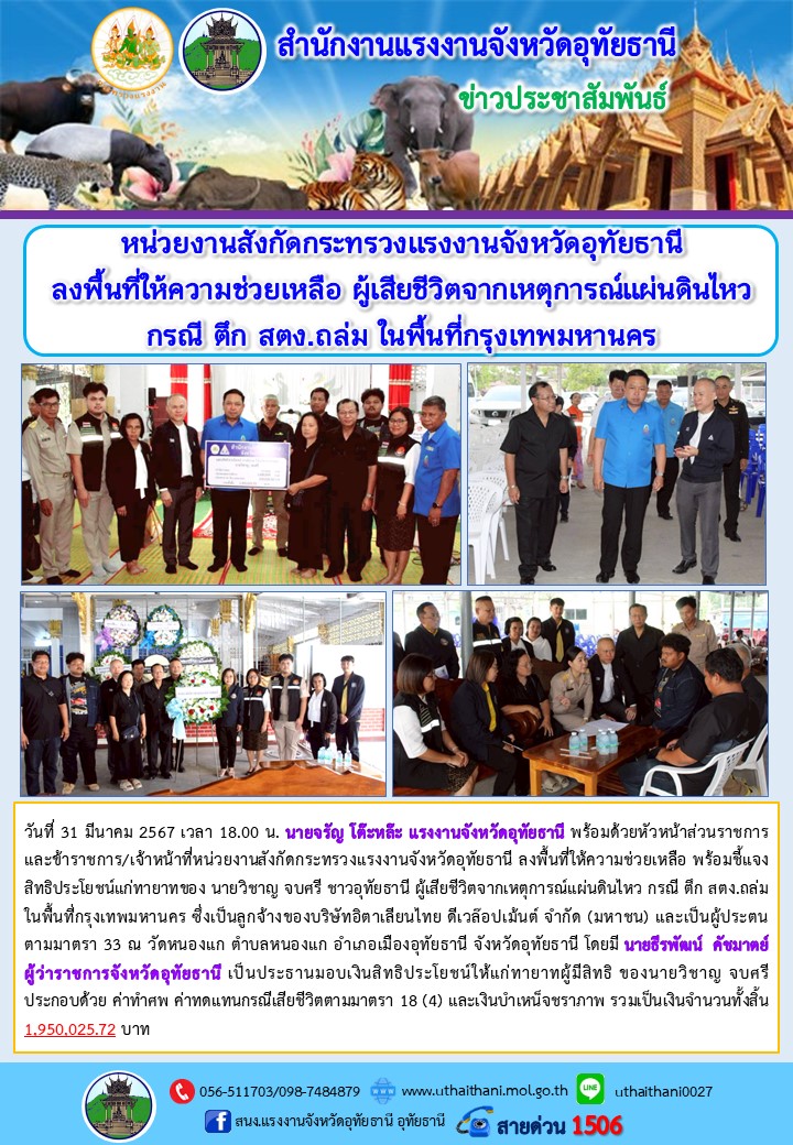 หน่วยงานสังกัดกระทรวงแรงงานจังหวัดอุทัยธานี ลงพื้นที่ให้ความช่วยเหลือ ผู้เสียชีวิตจากเหตุการณ์แผ่นดินไหว กรณี ตึก สตง.ถล่ม ในพื้นที่กรุงเทพมหานคร