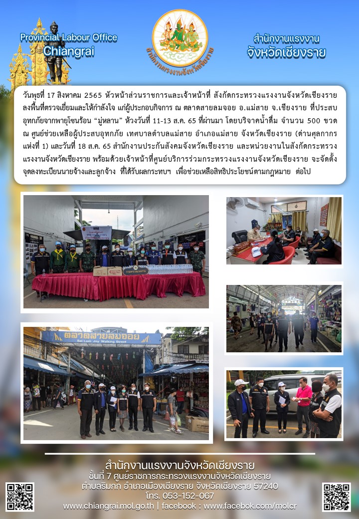 หน่วยงานสังกัดกระทรวงแรงงานจังหวัดเชียงราย ลงพื้นที่ตรวจเยี่ยมผู้ประกอบกิจการ ณ.ตลาดสายลมจอย ตำบลแม่สาย อำเภอแม่สาย เพื่อประสานงานช่วยเหลือนายจ้างและลูกจ้าง ผลกระทบอุทกภัยจากพายุโซนร้อน“มู่หลาน”ในพื้นที่จังหวัดเชียงราย