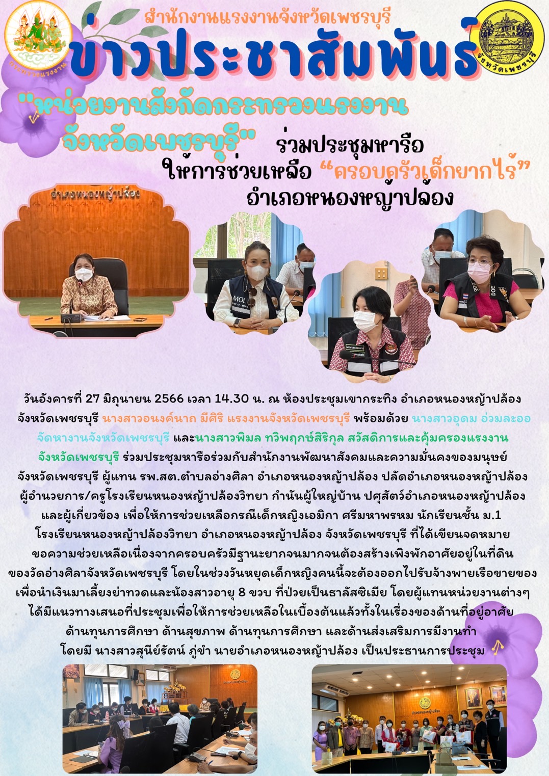 วันอังคารที่ 27 มิถุนายน 2566 เวลา 14.30 น. ณ ห้องประชุมเขากระทิง อำเภอหนองหญ้าปล้อง จังหวัดเพชรบุรีนางสาวอนงค์นาถ มีศิริ แรงงานจังหวัดเพชรบุรี พร้อมด้วย นางสาวอุดม อ่วมละออ จัดหางานจังหวัดเพชรบุรี และนางสาวพิมล ทวิพฤกษ์สิริกุล สวัสดิการและคุ้มครองแรงงานจังหวัดเพชรบุรี ร่วมประชุมหารือร่วมกับสำนักงานพัฒนาสังคมและความมั่นคงของมนุษย์จังหวัดเพชรบุรี ผู้แทน รพ.สต.ตำบลอ่างศิลา อำเภอหนองหญ้าปล้อง ปลัดอำเภอหนองหญ้าปล้อง ผู้อำนวยการ/ครูโรงเรียนหนองหญ้าปล้องวิทยา กำนันผู้ใหญ่บ้าน ปศุสัตว์อำเภอหนองหญ้าปล้อง และผู้เกี่ยวข้อง เพื่อให้การช่วยเหลือกรณีเด็กหญิงเอมิกา ศรีมหาพรหม นักเรียนชั้น ม.1 โรงเรียนหนองหญ้าปล้องวิทยา อำเภอหนองหญ้าปล้อง จังหวัดเพชรบุรี ที่ได้เขียนจดหมายขอความช่วยเหลือเนื่องจากครอบครัวมีฐานะยากจนมากจนต้องสร้างเพิงพักอาศัยอยู่ในที่ดินของ วัดอ่างศิลาจังหวัดเพชรบุรี โดยในช่วงวันหยุดเด็กหญิงคนนี้จะต้องออกไปรับจ้างพายเรือขายของเพื่อนำเงินมาเลี่ยงย่าย่าทวดและน้องสาวอายุ 8 ขวบ ที่ป่วยเป็นธาลัสซิเมีย โดยผู้แทนหน่วยงานต่างๆได้มีแนวทางเสนอที่ประชุมเพื่อให้การช่วยเหลือในเบื้องต้นแล้วทั้งในเรื่องของด้านที่อยู่อาศัย ด้านทุนการศึกษา ด้านสุขภาพ ด้านทุนการศึกษา และด้านส่งเสริมการมีงานทำ โดยมี นางสาวสุนีย์รัตน์ ภู่ขำ นายอำเภอหนองหญ้าปล้อง เป็นประธานการประชุม