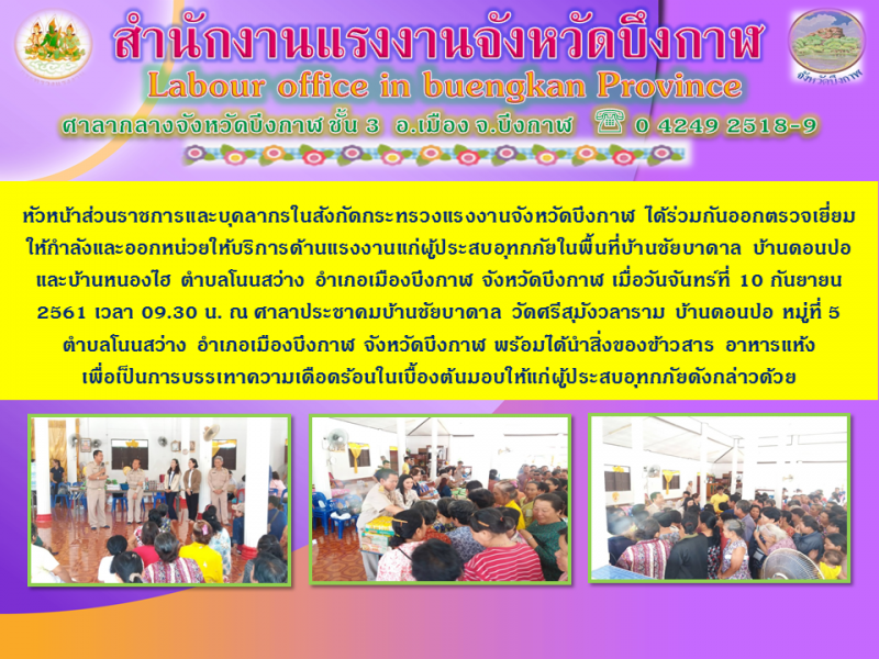 หน่วยงานสังกัดกระทรวงแรงงานร่วมออกตรวจเยี่ยมให้กำลังใจผู้ประสบอุทกภัยในพื้นที่จังหวัดบึงกาฬ
