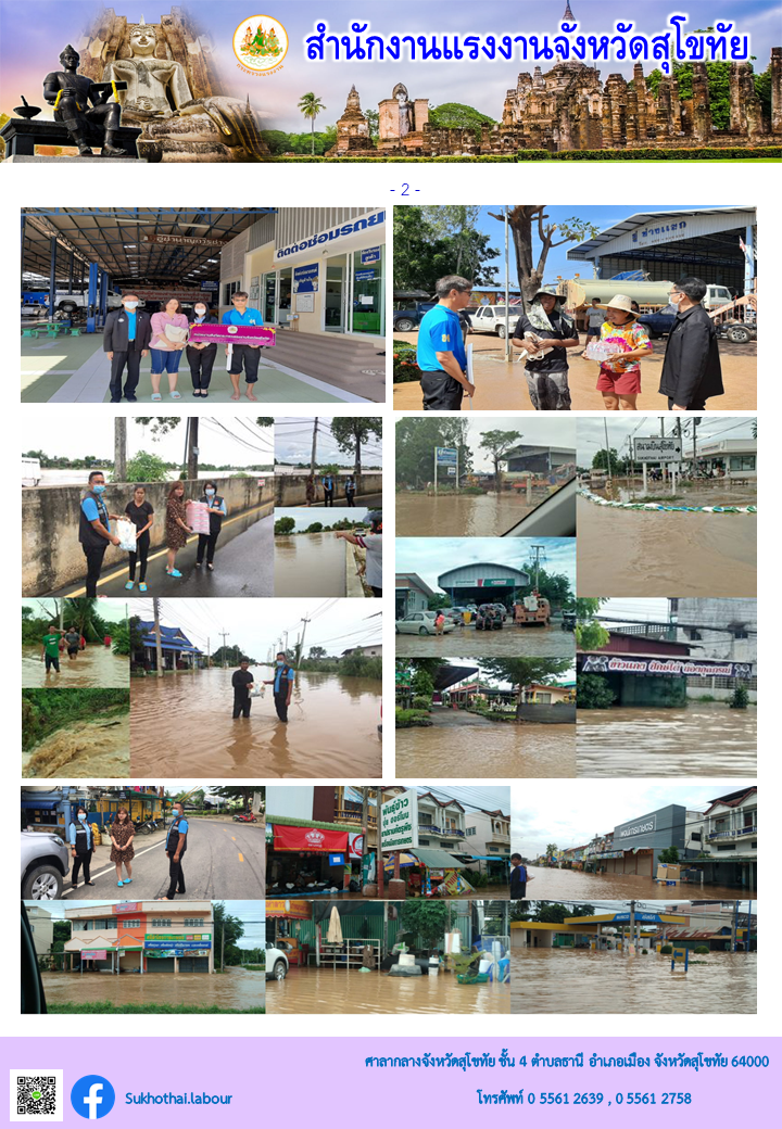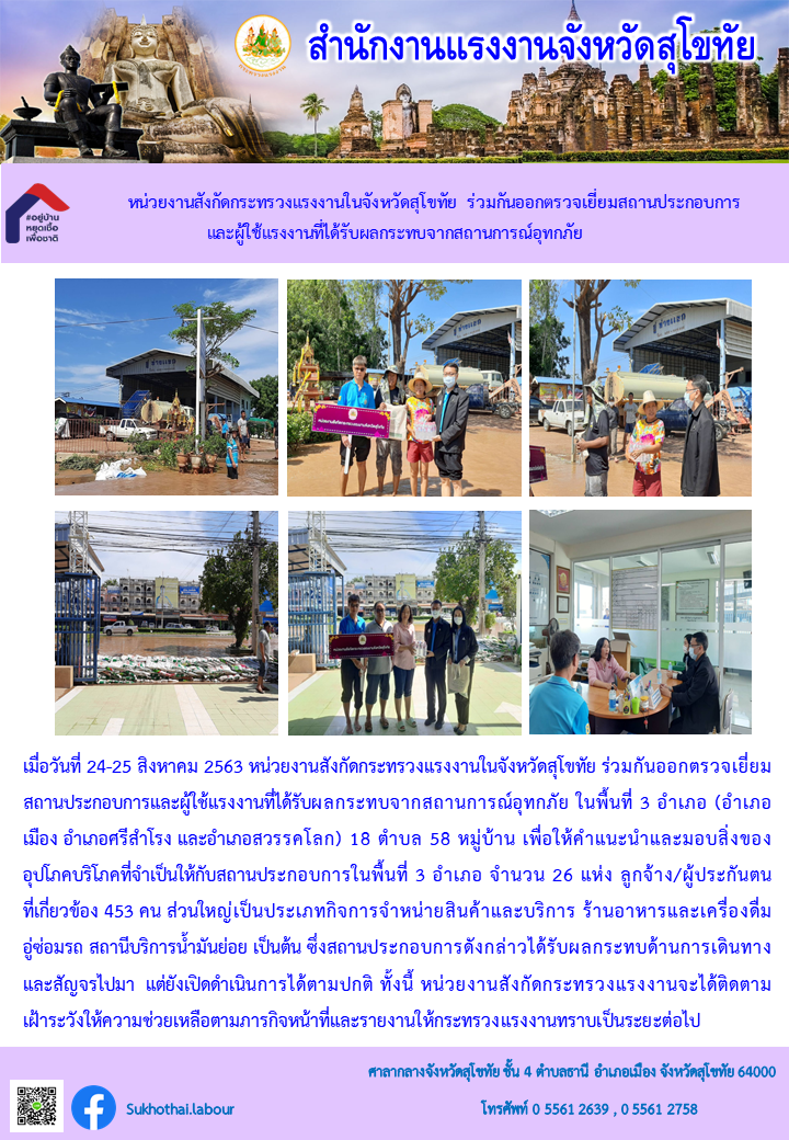 หน่วยงานสังกัดกระทรวงแรงงานในจังหวัดสุโขทัย ร่วมกันออกตรวจเยี่ยมสถานประกอบการ และผู้ใช้แรงงานที่ได้รับผลกระทบจากสถานการณ์อุทกภัย