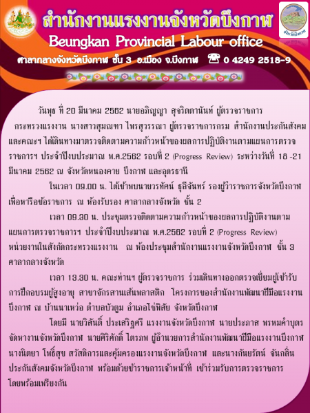 หน่วยงานสังกัดกระทรวงแรงงาน สำนักงานแรงงานจังหวัดบึงกาฬ ร่วมรับการตรวจราชการ รอบที่ 2 (Progress Review)