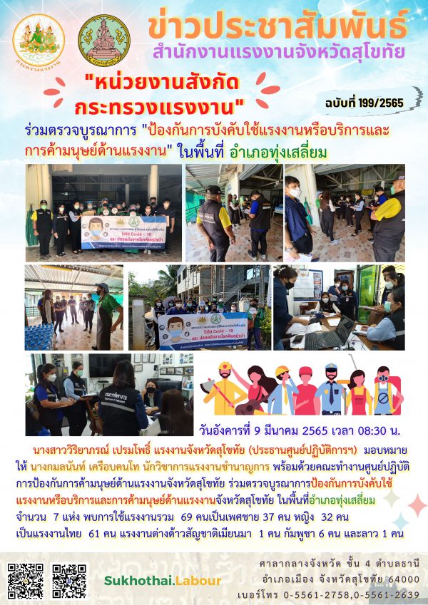 หน่วยงานสังกัดกระทรวงแรงงาน ร่วมตรวจบูรณาการป้องกันการบังคับใช้แรงงานหรือบริการ และการค้ามนุษย์ด้านแรงงาน ในพื้นที่อำเภอทุ่งเสลี่ยม