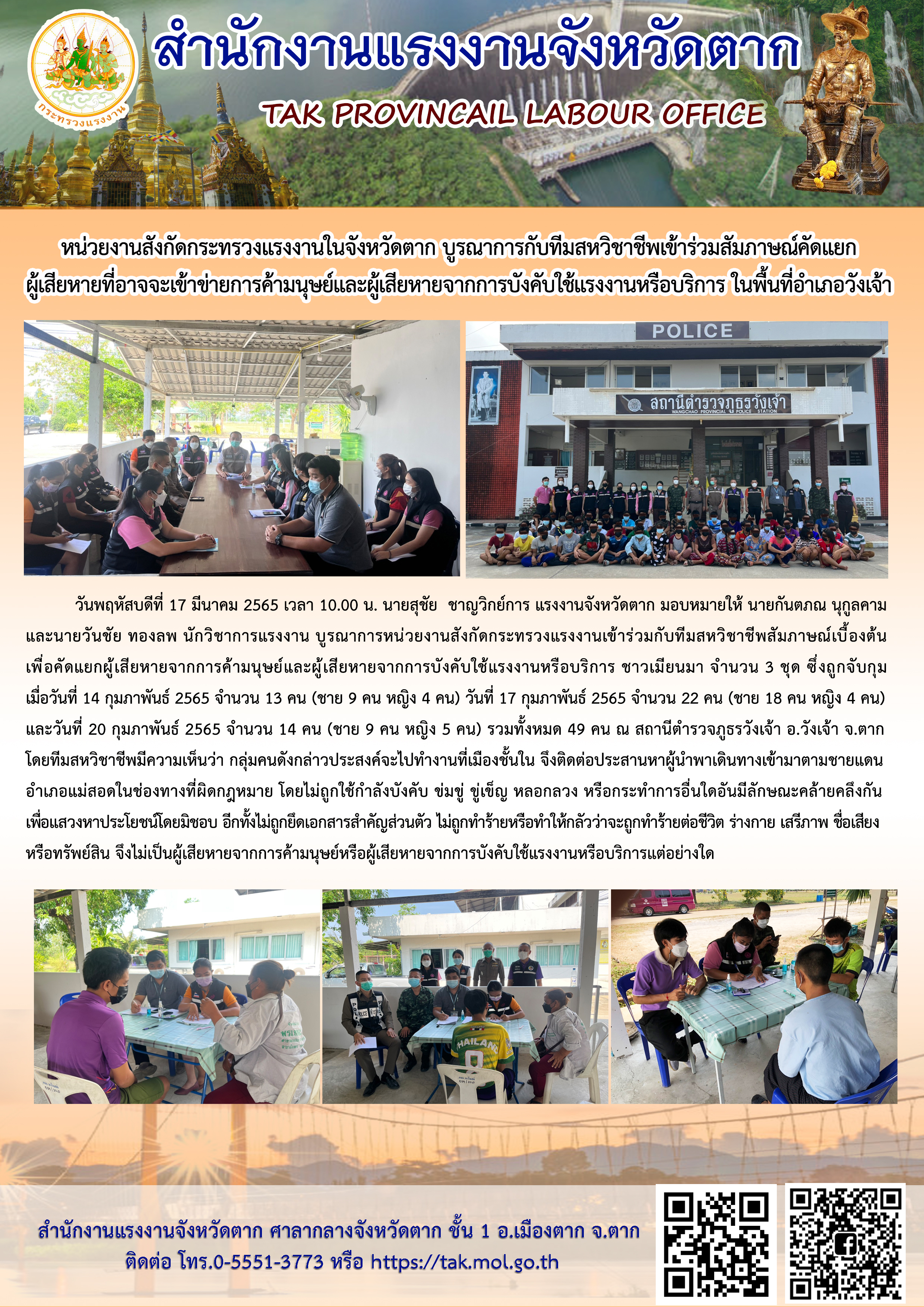 หน่วยงานสังกัดกระทรวงแรงงานในจังหวัดตาก บูรณาการกับทีมสหวิชาชีพเข้าร่วมสัมภาษณ์คัดแยกผู้เสียหายที่อาจจะเข้าข่ายการค้ามนุษย์และผู้เสียหายจากการบังคับใช้แรงงานหรือบริการ ในพื้นที่อำเภอวังเจ้า